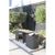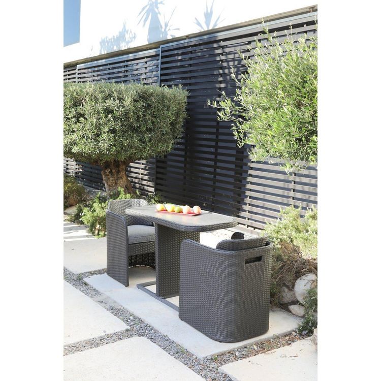Set composé : 1 table 120x54x75 cm - 2 fauteuils 53x59x78 cm, structure en acier, résine tressée coloris anthracite, plateau en verre effet ton pierre, fauteuils avec dossiers rabattables, coussins en polyester déhoussables, rangement facile des fauteuils sous la table,
