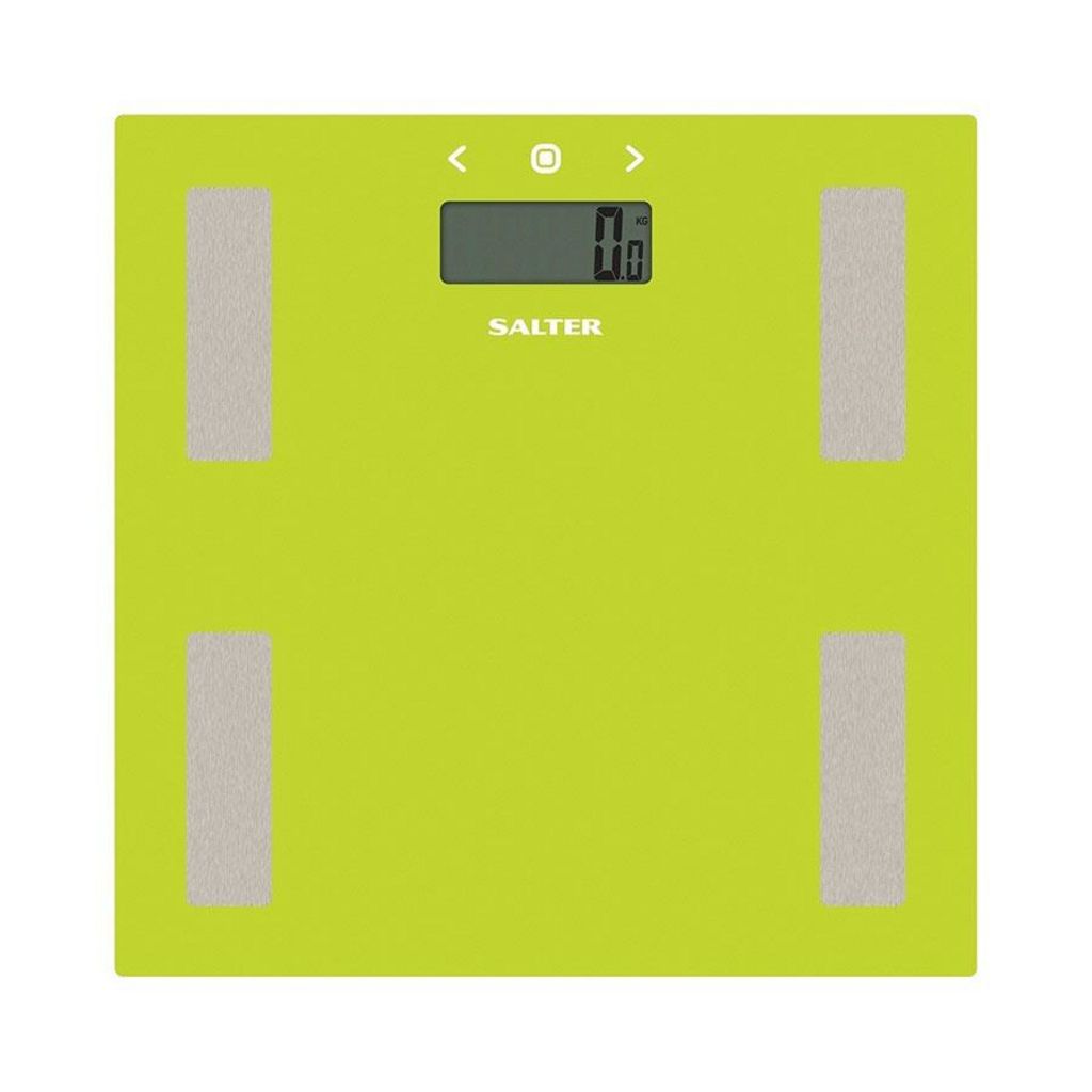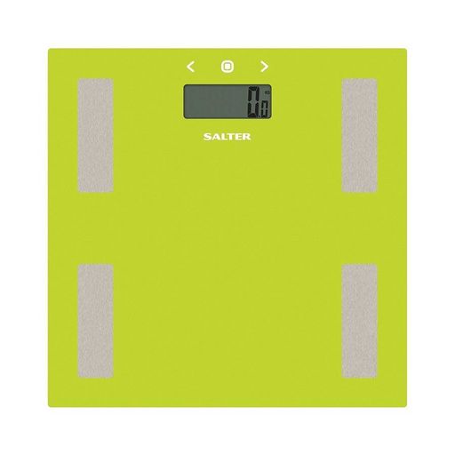 Analyse corporelle : poids, taux de graisse, de la masse musculaire et de la masse hydrique et de l'IMC, plateau en verre ultra fin, écran LCD, 8 mémoires, mode athlète, capacité de 200 kg, graduation de 0.1 kg, vert
