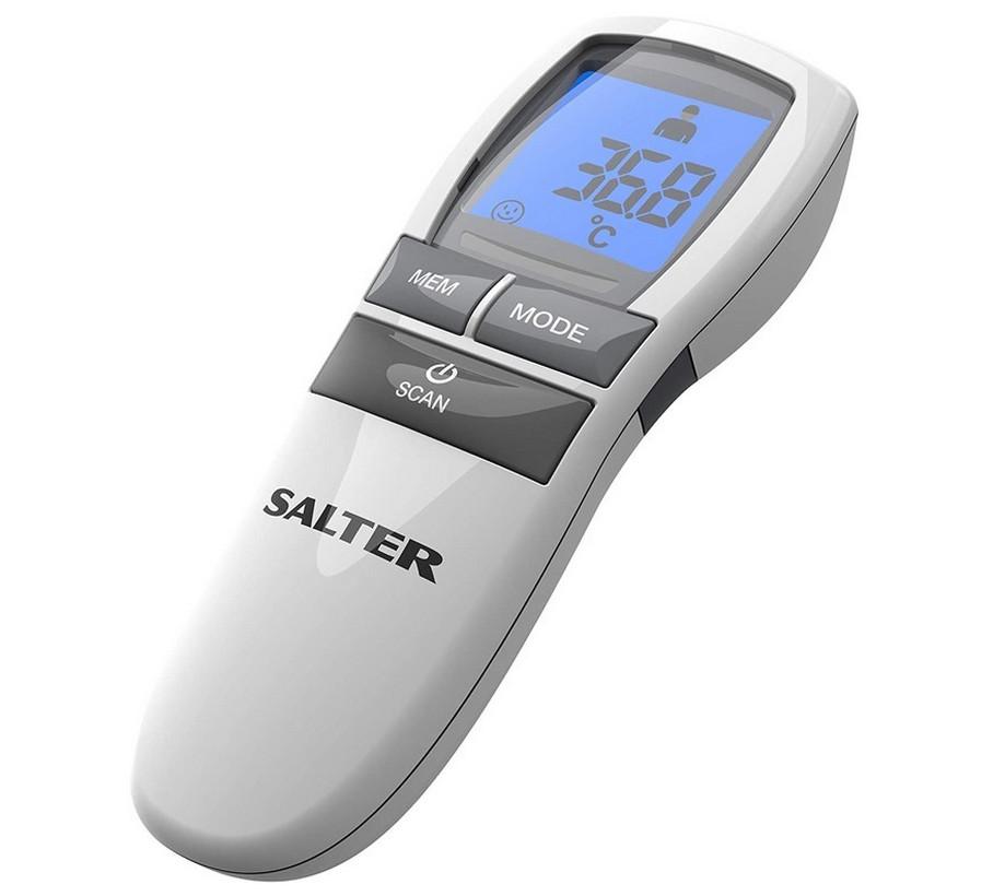 Salter TE250EU Thermomètre frontal Salter TE250EU sans contact : grâce à sa technologie infrarouge mesure sans contact à une distance de 0.5-3 cm. Utilisation facile : pointez simplement votre thermomètre Salter vers votre tempe, appuyez sur le bouton et une température précise s?affichera instantanément sur le grand écran LCD rétroéclairé. Alarme fièvre : notre thermomètre est doté d?une alarme fièvre qui sonne lorsque la température dépasse les 38C/100.4 F. 30 mémoires ? avec la possibilité d?enregistrer jusqu?à 30 relevés afin de suivre évolution de la température des bébés, enfants et adultes en degrés Celsius ou Fahrenheit. La famille avant tout ? avec sa prise de température instantanée, son grand écran LCD rétroéclaire et son mode nuit, il est facile de mesurer la température de votre enfant pendant son sommeil.