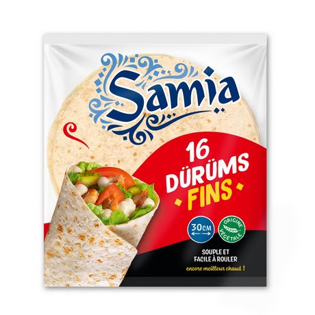 Le Dürüm est une fine galette de pain que l'on garnit d'ingrédients variés : viandes émincées, légumes, épices, oignons, sauces… Il est utilisé par les restaurants de kebab. Facile à rouler. Samia vous propose un format maxi par 16.