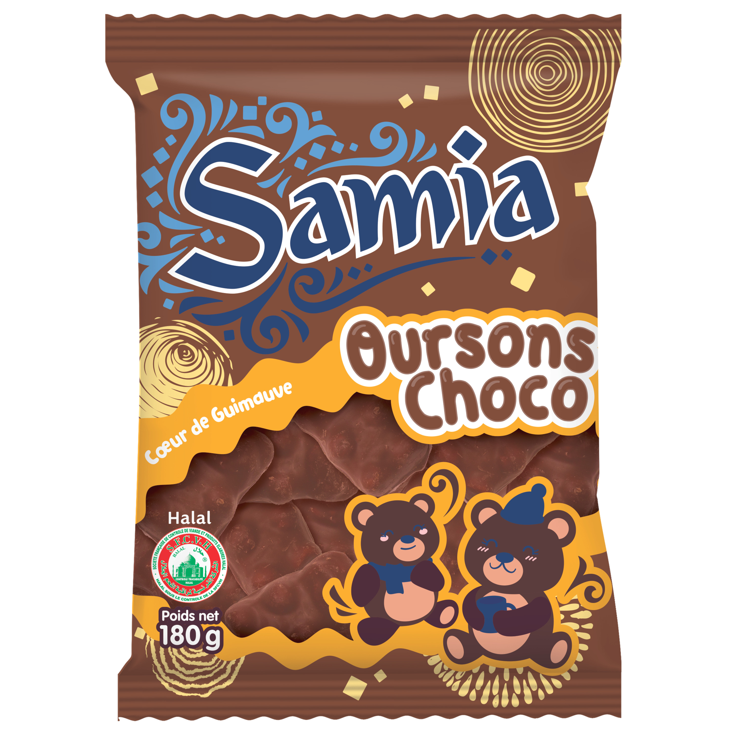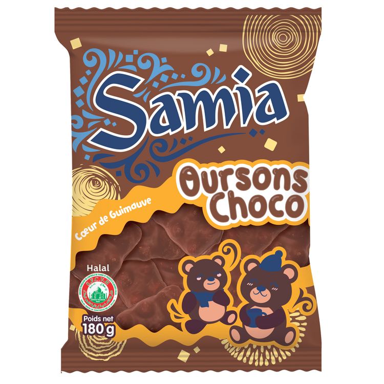 Oursons guimauve enrobés de chocolat au lait à base de gélatine de bœuf halal. Ils sont certifiés HALAL par l'organisme SFCVH. Il sont vendus en sachets.