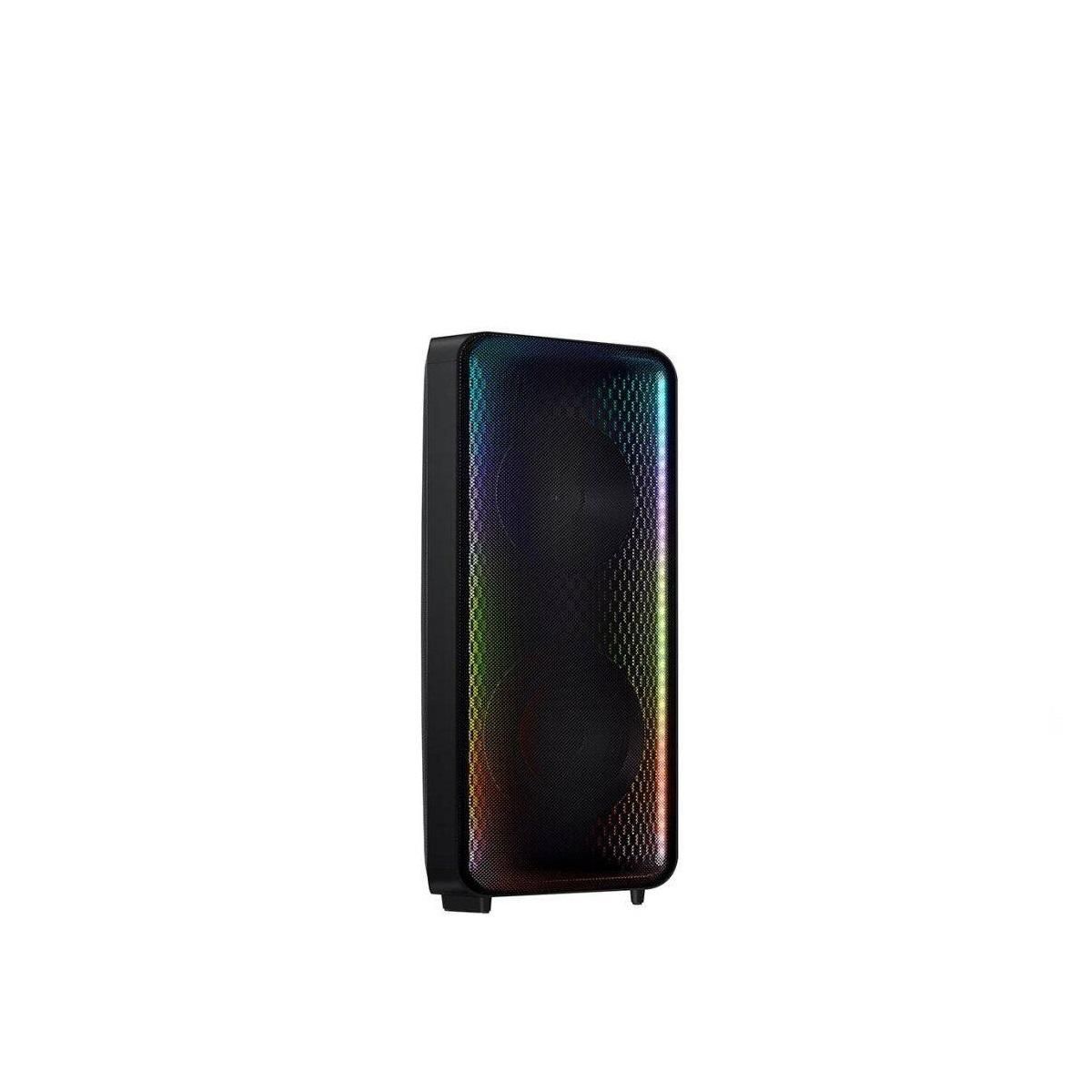 Samsung MX-ST50B/ZF Enceinte nomade Bluetooth Samsung MX-ST50B/ZF ultra-puissante. Profitez du tout nouveau design des SoundTower Samsung. Un design renouvelé qui préserve l'identité unique de Samsung. Son bi-directionnel : profitez d'un son enveloppant dans toute la pièce. Son puissant de 240 Watts : boostez votre soirée avec un son saisissant de 240W. Dynamic Bass : vibrez avec des basses ultra puissantes. Emmenez votre SoundTower partout sans problèmes grâce à son alimentation par batterie, qui vous permettra de profiter de votre musique pendant 18 heures. Modes Sonores : Party, Standard, Hip-Hop, Rock, Latin, House, Reggae... Effets de lumière : depuis l'application dédiée, changez la lumière en fonction de l'ambiance souhaitée. Fonction DJ : créez les effets sonores que vous souhaitez (Noise, Crush, Filter, Chorus...). N'ayez plus peur de profiter de votre musique en extérieur. La MX-ST50B est résistante à l'eau avec un indice IPX5. Bluetooth : appairez deux smartphones simultanément. Connectez jusqu'à 10 enceintes sans câbles supplémentaires pour créer un système audio complet. Connectivité : Bluetooth, USB, RCA, AUX.