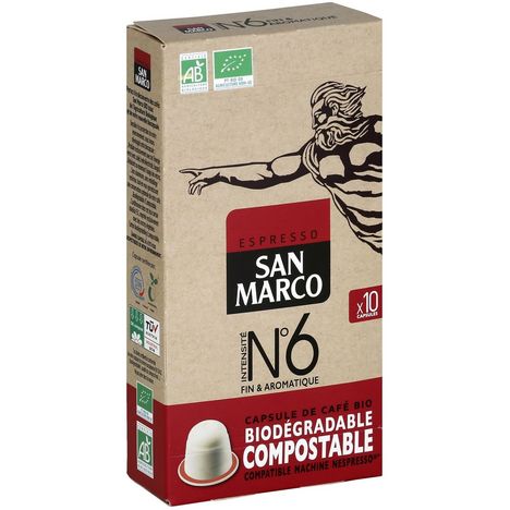 Capsules San Marco Bio Compostables N°6 x 10 Partez à la découverte des cafés San Marco BIO issus de l'Agriculture Biologique et de notre nouvelle biocapsule. Sensible à la protection de notre environnement, nous avons développé cette biocapsule : - Produite exclusivement avec de l'énergie verte (vent,soleil, hydroélectricité,biogaz) - Réduisant au maximum l'usage des encres. - Sans aluminium, sans emballage extérieur, tout en garnatisant une conservation optimale de votre café. - Biodégradable / Compostable - Conditionnée dans un étui carton labeliisé FSC, imprimé exclusivement avec des encres végétales. Carton biodégradable et compostable