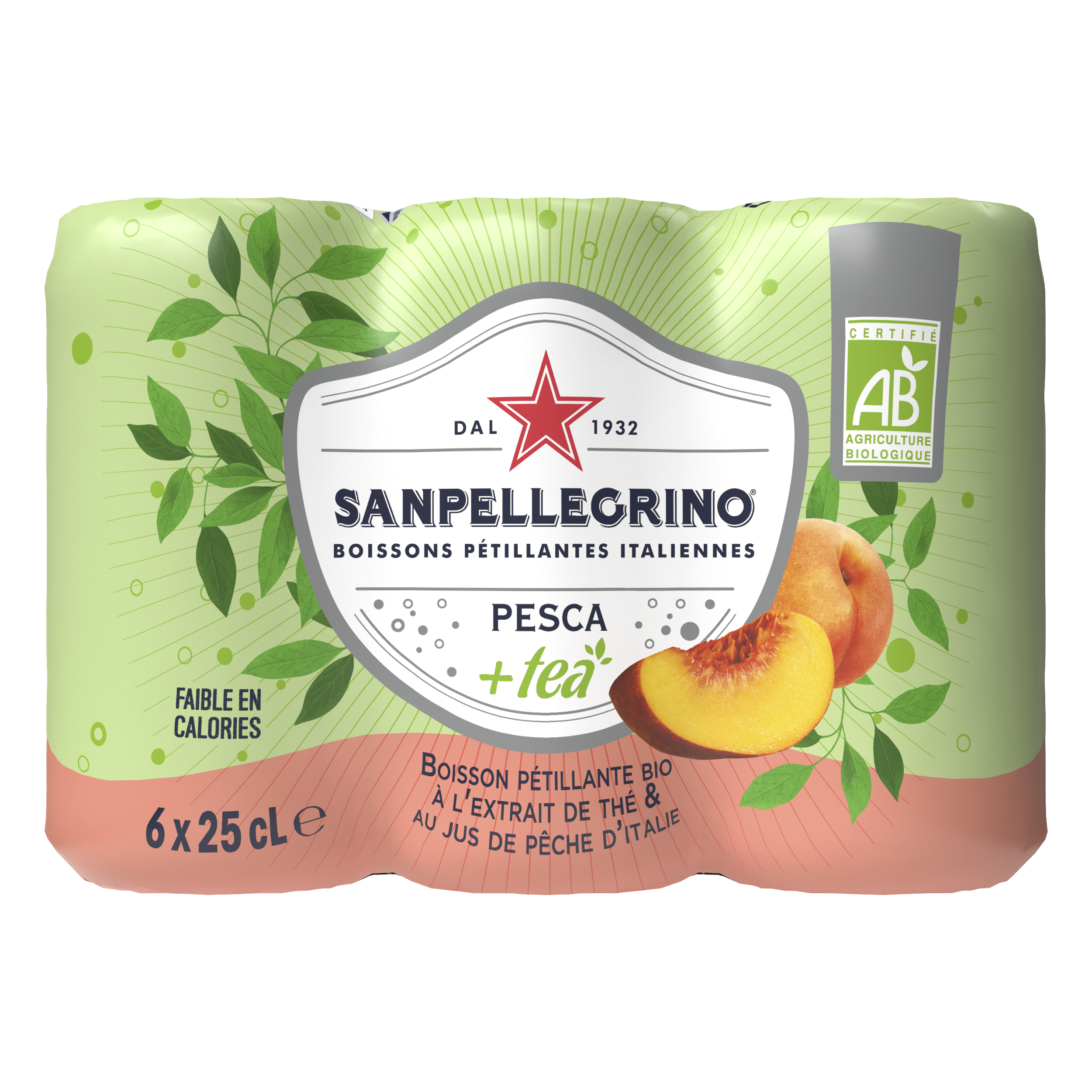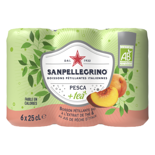 Et si on s'accordait une petite pause plaisir loin du brouhaha du quotidien ? Et cela en toute simplicité … Les boissons pétillantes aux fruits et à l'extrait de thé bio de SANPELLEGRINO sont une parfaite invitation au bien-être et à l'évasion. Découvrez le délicieux parfum de Pesca+tea, détendez-vous et évadez-vous le temps d’une gorgée.Une combinaison parfaite d’eau pétillante, de jus de pêches mûris sous le soleil d’Italie et d’extrait de thé. Des ingrédients de grande qualité,sélectionnés avec soin. Une boisson certifiée BIO, faible en calories. Une opercule de protection unique Boisson pétillante à l'extrait de thé et au jus de pêches à base de concentré, aromatisée et avec adjonction de gaz carbonique