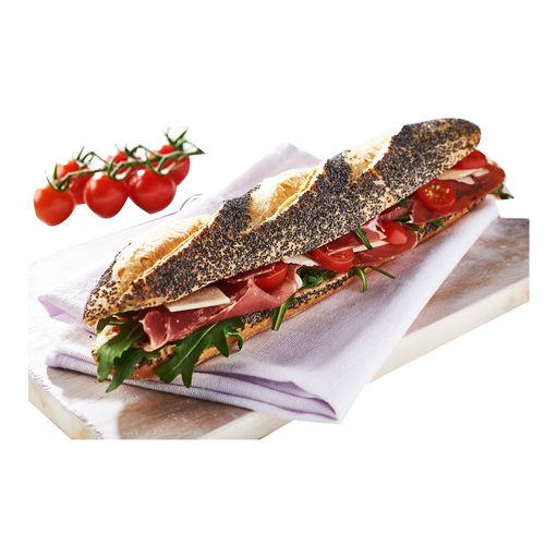 Déjeunette pavot 51% (farine de BLE (farine de BLE, GLUTEN de BLE, farine de BLE malte), eau, pavot 9,1%, sel, levure), allumettes de jambon cru 20,4% (jambon de porc (origine UE), sel, conservateur : E252), cubes de tomates assaisonnées 12,2% (Tomates fraîches (69%), tomates confites (17%), huile d'olive extra vierge, basilic, conservateur: E326, préparation épaississante: (amidon modifié, épaississant: E415, dextrose, acidifiants: E330, E334, LACTOSE, maltodextrine), ail (0,3%), antioxydant: E301, sucre, origan, sel), tomate cerise, grana padano 4,1% (LAIT cru de vache (origine italie), sel, présure animale, conservateur : E1105 d'OEUF), roquette.