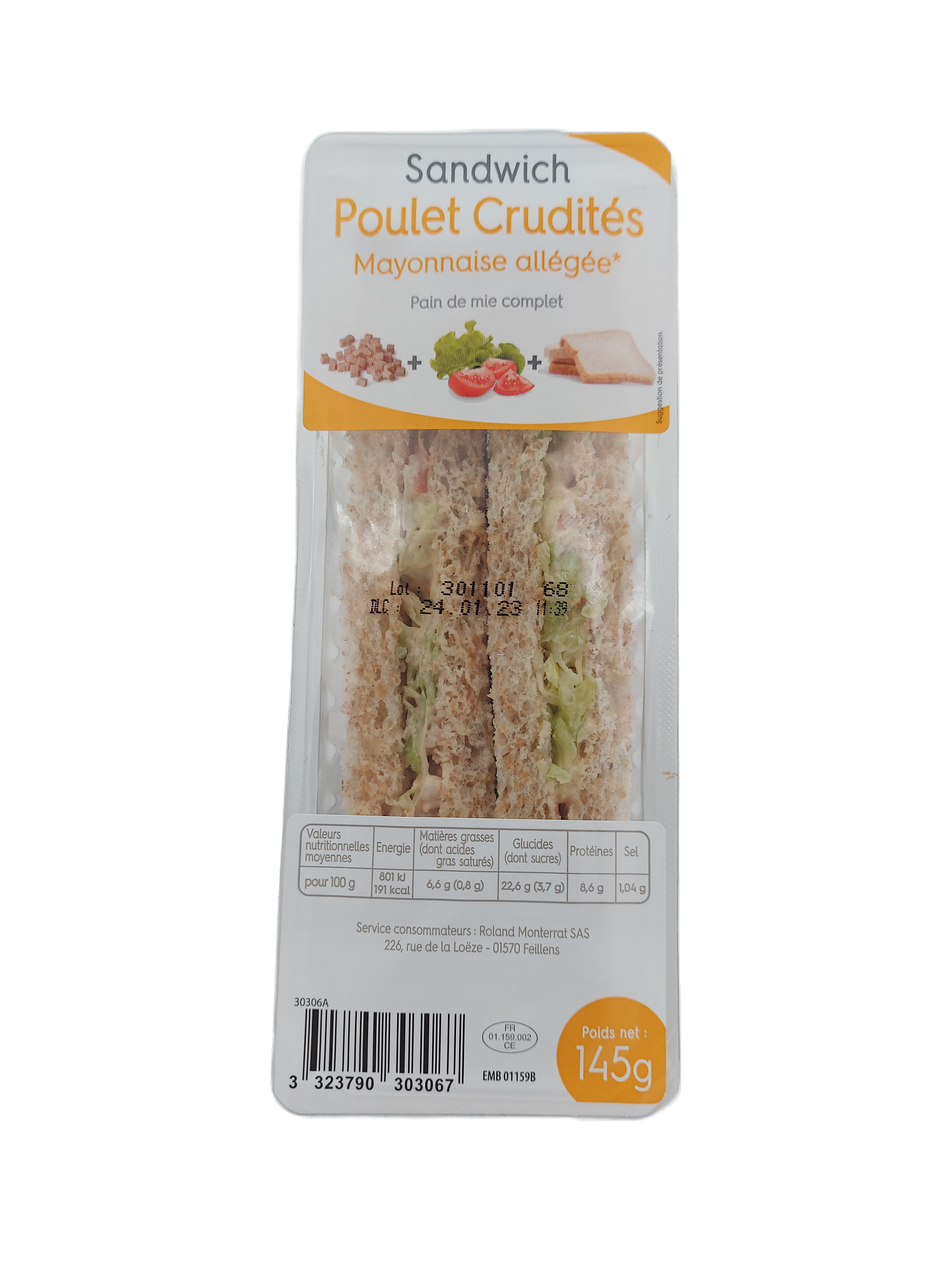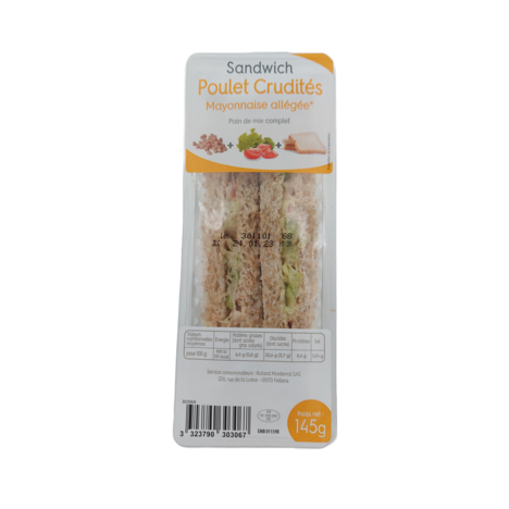 Sandwich au pain de mie complet garni de dés de viande de poulet rôtie traitée en salaison, de tomate,
