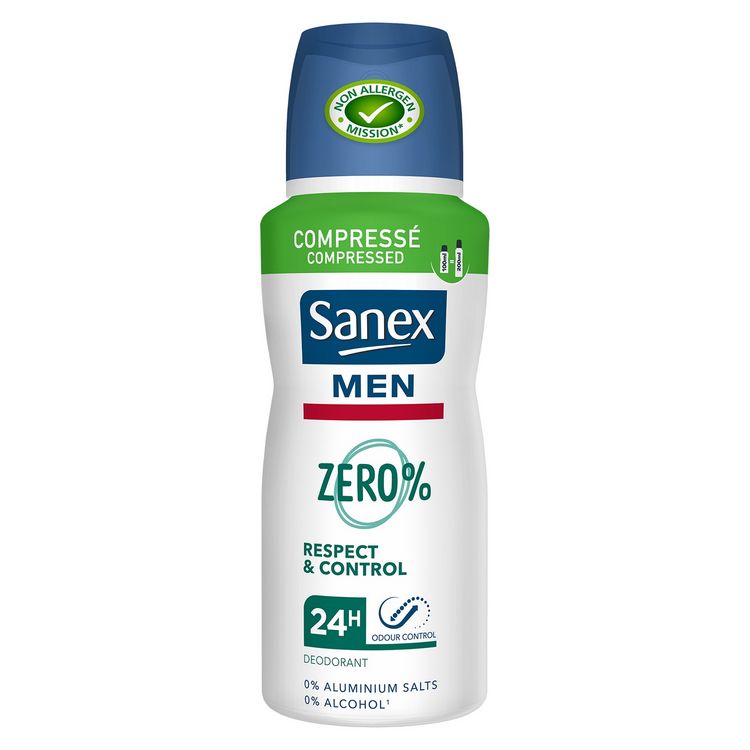 Déodorant Sanex Men Zéro 0% Respect&Control pour hommes contient 0% sels d'aluminium. 0% d'alcool éthylique. Testé dermatologiquement.