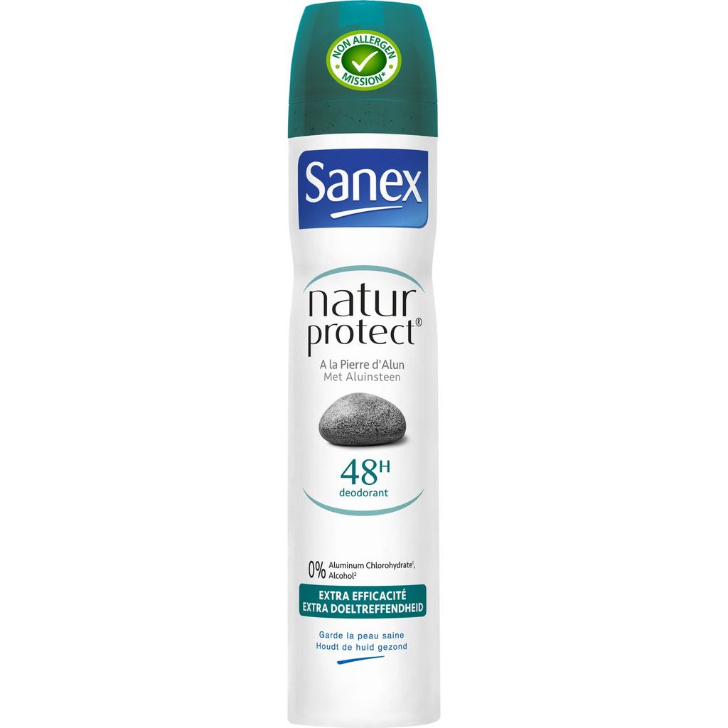 SANEX NATUR PROTECT EXTRA EFFICACITE 48H DEODORANT SPRAY 200ML Le déodorant Sanex Natur Protect extra efficacity pour hommes et femmes contient de la pierre d'Alun, dont les propriétés déodorantes offrent une protection efficace contre les odeurs pendant 48H. Testé dermatologiquement. Sans éthanol. 0% alcool. 0% colorants