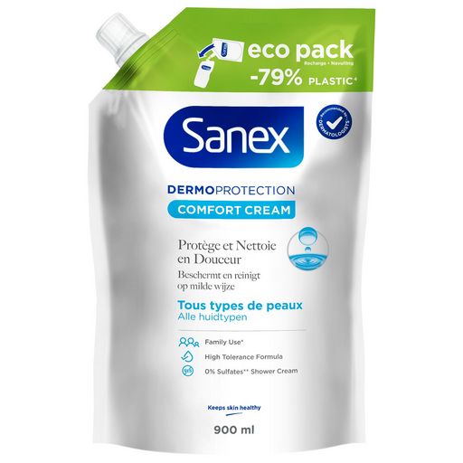La crème de douche Sanex Dermo Protection Confort adaptée à toute la famille* a été développée avec des dermatologues pour nettoyer en douceur et protéger tout type de peau. Elle rend la peau plus résistante. * À partir de 3 ans.