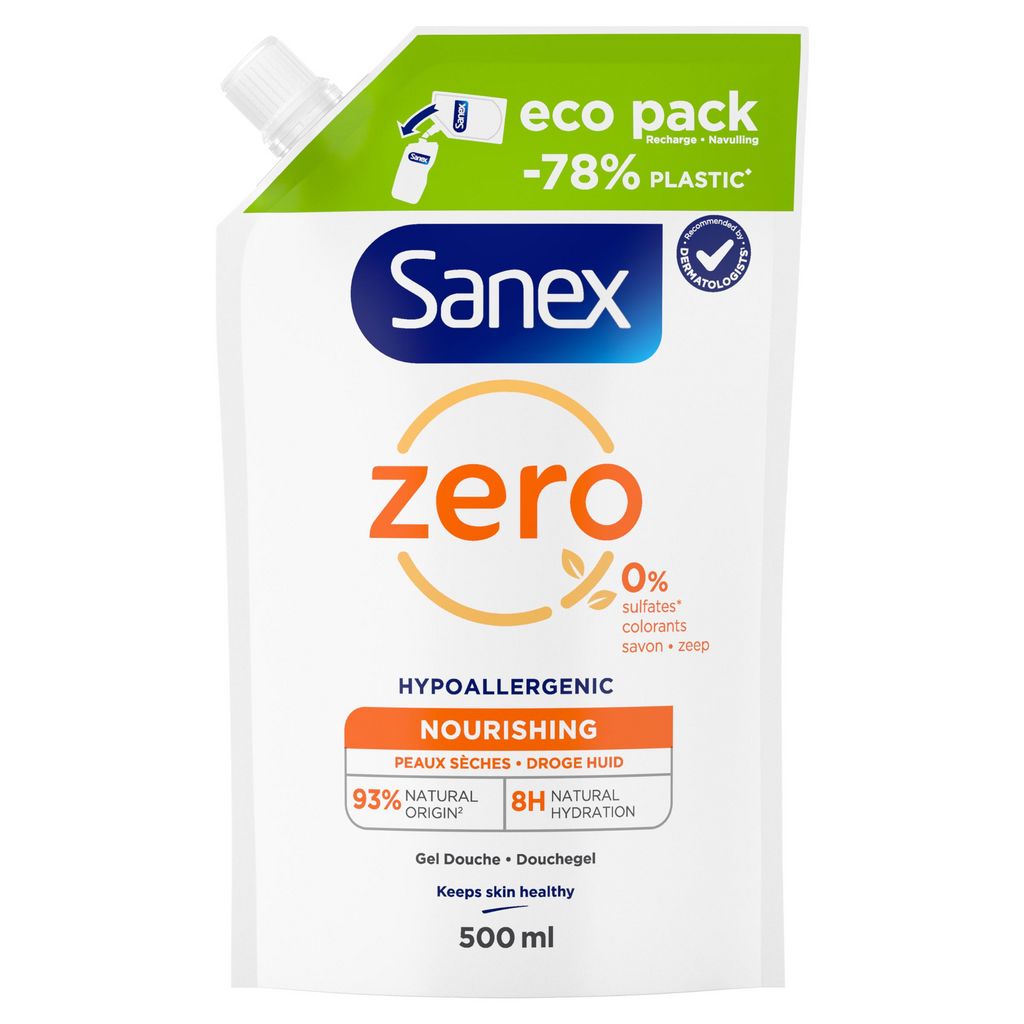 La recharge de gel douche Nourrissant Sanex Zero% pour peaux sèches a été formulée avec des ingrédients essentiels. Elle maintient la peau hydratée jusqu’à 8 heures. La recharge de gel douche ne contient aucun microplastique, sulfate ni colorant.