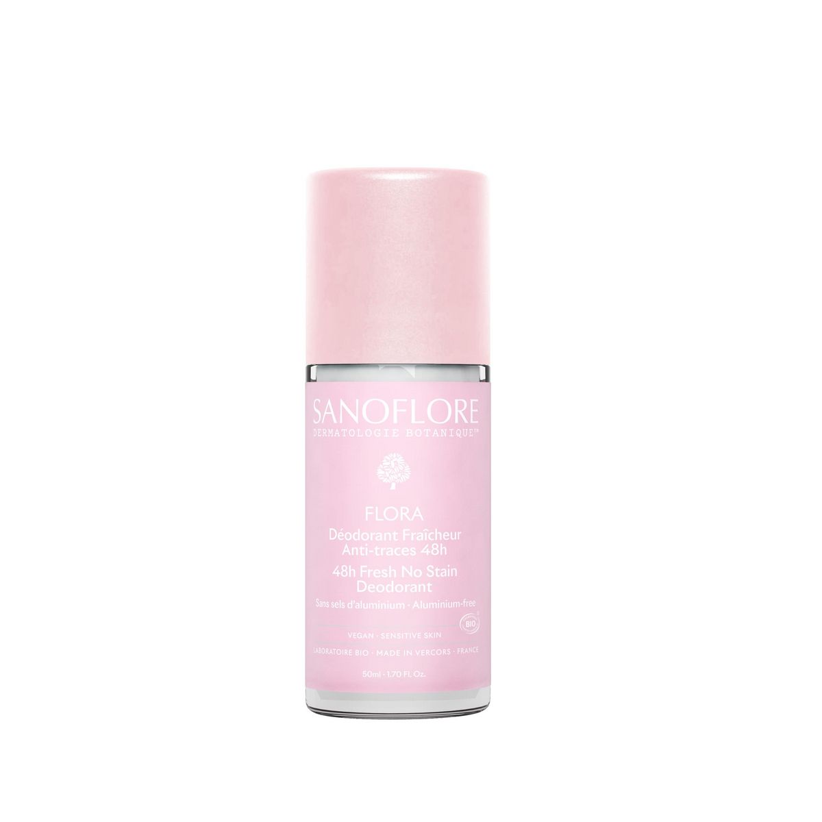 "Découvrez le Déodorant roll-on en verre rechargeable FLORA avec 48h d'efficacité dans une formule 100% d'origine naturelle, certifié bio.