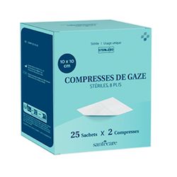 Nom du produit : Compresses de Gaze – 10×10 – 25×2 – LPPR. Détails : 8 plis, usage unique. Unités par boîte : 50 pcs (25 sachets de 2 compresses)Stockage : Conserver à l’abri de la lumière du soleil. Caractéristiques : Stérile, 8 plis. Mode d’emploi : Se laver les mains. Appliquer la compresse sur la plaie et la maintenir place à l’aide d’un sparadrap ou bande. Conserver les sachets dans leur boîte d’origine
