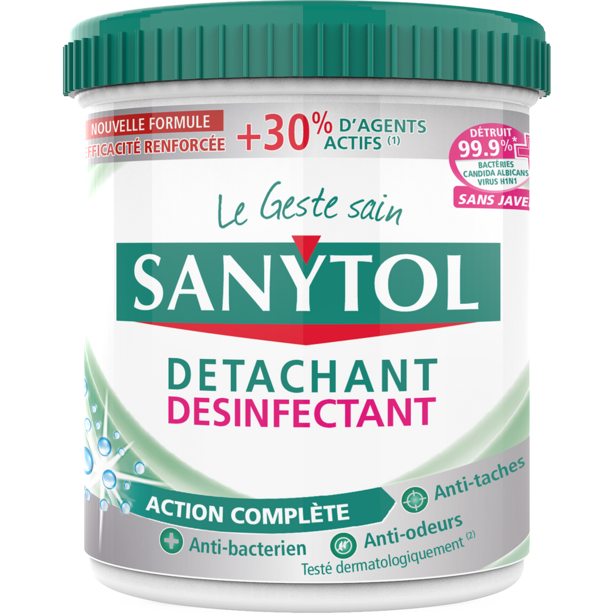 SANYTOL, l’expert de la désinfection sans javel, a développé un détachant désinfectant "Action complète" qui élimine microbes, mauvaises odeurs et taches tenaces dès 30°C. Sa formule enrichie en enzymes pénètre au cœur des fibres textiles et libère des agents de détachage pour un résultat impeccable.