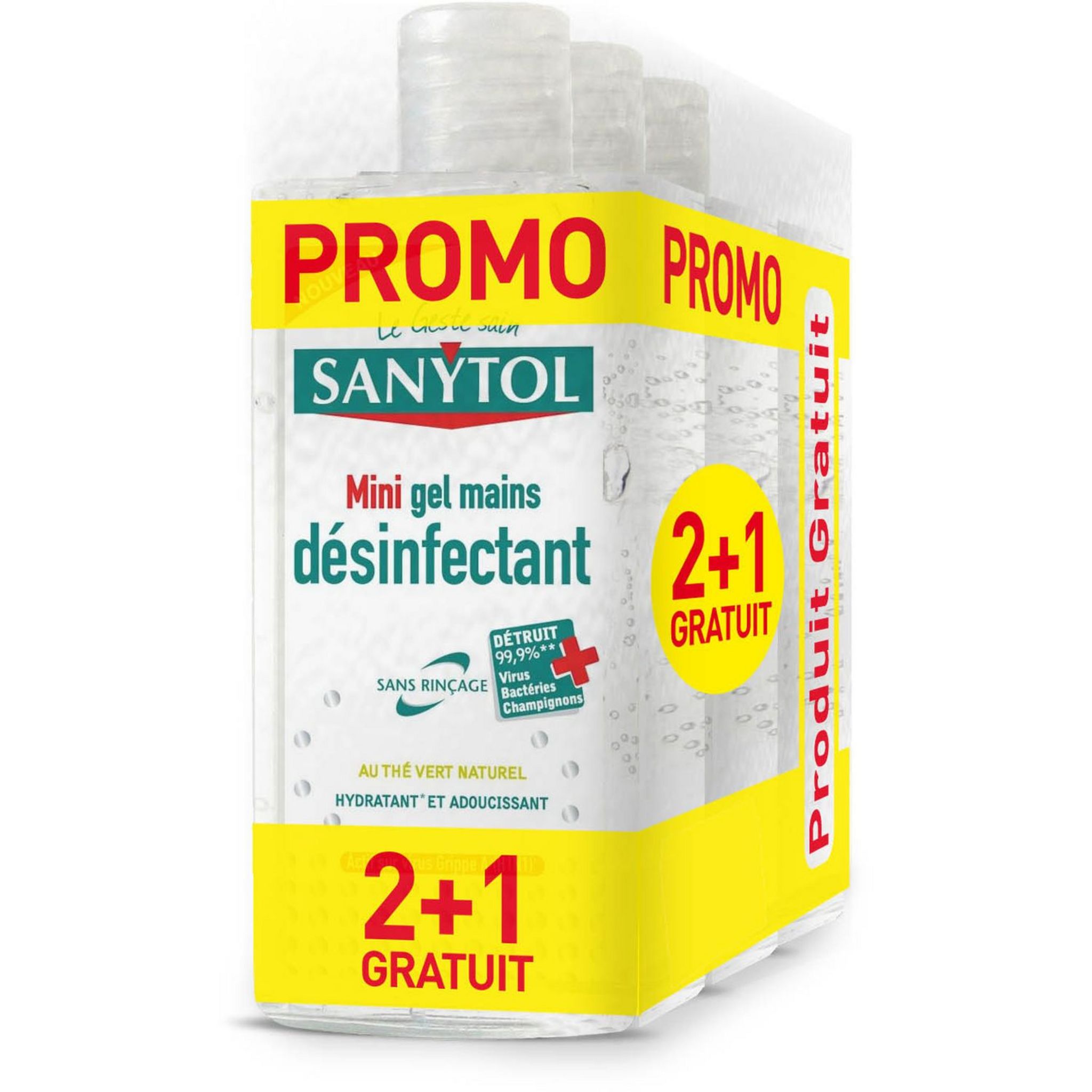 Gel Mains Désinfectant 75ml lot 2+1 gratuit SANYTOL La majorité des maladies infectieuses se transmet par les mains. Grâce à sa formule triple actions, le gel mains désinfectant Sanytol élimine 99.9% des virus, bactéries et champignons. Il laisse les mains propres, saines, douces et délicatement parfumées.