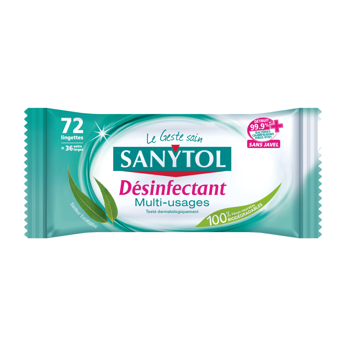 Pratiques et efficaces, les lingettes désinfectantes multi-usages SANYTOL nettoient et désinfectent toutes les surfaces en un seul geste ! Idéal pour : abattants de WC, poignées de portes, interrupteurs, téléphones fixes, chaises hautes, plans de travail, poubelles, télécommandes, claviers d’ordinateurs...