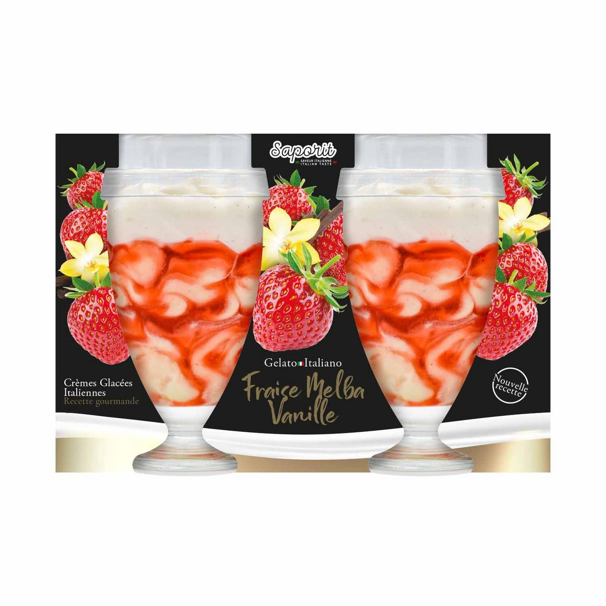 Très beaux verres à pied servant de coupelle a la fraise Melba. Présentation : ras. Glace vanille de Madagascar saupoudrée de morceaux de cacahuètes enrobés. 2ème couche en glace saveur fraise et coulis fraise pour terminer. Légèrement trop sucrées à mon goût mais ce désert reste qualitatif et on garde les verres ! La quantité ne paraît pas mais est copieuse.