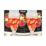 LAIT écrémé réhydraté*, sucre, purée de fraise 8%, sirop de fraise 8% (sirop de glucose, sucre, purée de fraise 20%, eau, acidifiant: acide citrique, épaississant: pectine, colorant: concentré végétal [chicorée, pomme et cassis], arôme naturel), huile de noix de coco, dextrose, sirop de glucose, grains pralinés d’amande 2% (AMANDES 50%, sucre), jus de citron, inuline, LACTOSE et protéines de LAIT, arômes naturels, gousses de vanille** 0,03%, colorant: concentré végétal (chicorée, pomme et cassis), émulsifiants: 1,2 propanediol esters d'acides gras, mono- et diglycérides d'acides gras; stabilisants: farine de graines de caroube, gomme de guar, méthylcellulose, carraghénane, pectine.