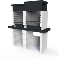 Barbecue DUPLEX en béton allégé à deux surfaces de cuisson indépendantes a bois. Plans en béton armé. Cheminée avec double grille de cuisson, 58x40 et 48x40 réglables sur 5 hauteurs. Base équipée de guides pour l’introduction des étagères. Teinté dans la masse. Montage facile. Plans de travail et unité foyer teintés dans la masse, le reste est à personnaliser avec la peinture à quartz Sarom pour le rendre blanc.