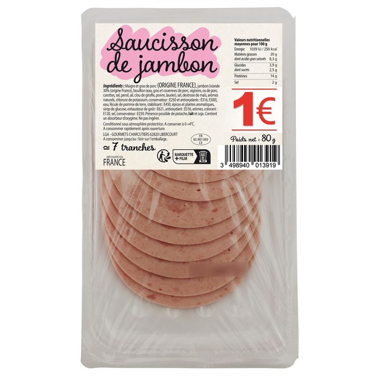Maigre et gras de porc (origine UE), jambon (viande 30 % (origine France), bouillon (eau, gras et couennes de porc, oignons, os de porc, carottes, sel, persil, ail, clou de girofle, poivre, laurier), sel, dextrose de mais, arômes naturels, chlorure de potassium, conservateur : E250 et antioxydants : E316, E300), eau fécule de pomme de terre, stabilisant : E450, épices et plantes aromatiques, sirop de glucose, exhausteur de goût : E621, antioxydant : E316, arômes, colorant : E120, sel, conservateur : E 250. Présence possible de pistache, lait, soja.