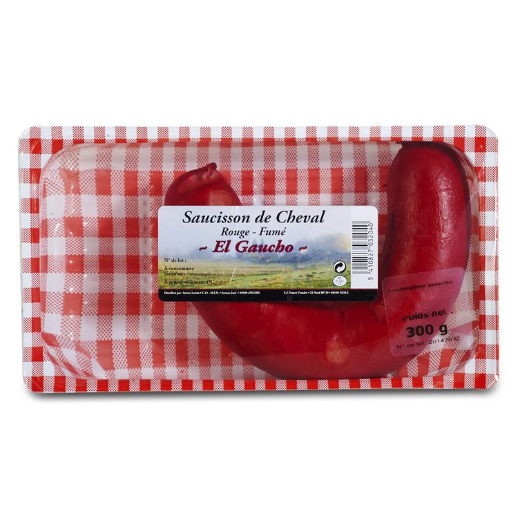 un bon saucisson de cheval c'est de la viande de cheval , un peu de gras , du poivre et un peu d'ail .. ici on a de la fécule, de la pomme de terre, des colorants, du gout fumé artificiel ..et a la dégustation ça se ressent !! 1er et dernier achat de ce produit