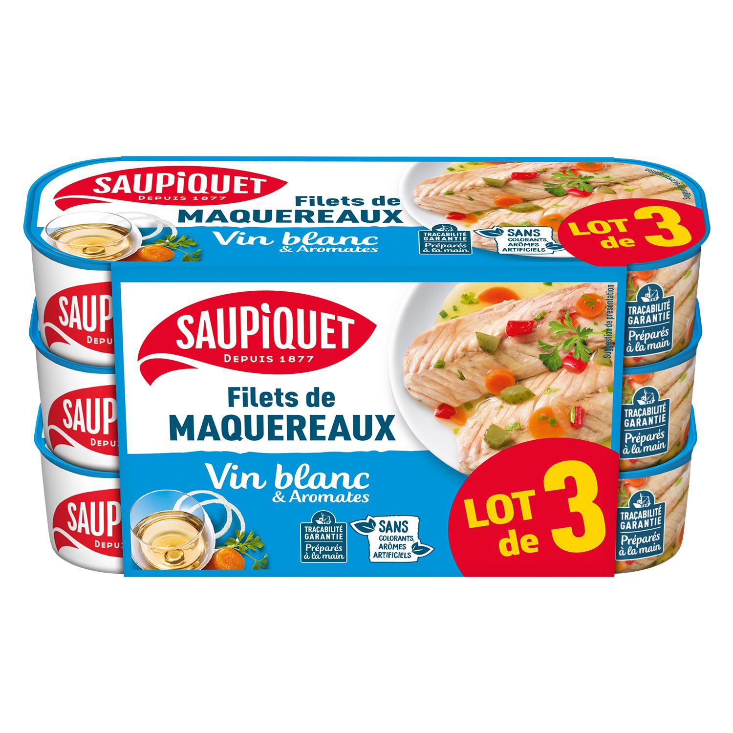 Filets de MAQUEREAUX** (60%), eau, légumes en proportion variable (10%) (cornichon, carotte, poivron rouge, oignon), vinaigre de vin blanc, vinaigre d'alcool, vin blanc (1,8%), sel, persil (0,5%), arômes naturels.