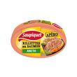 THON listao*, SAUMON rose du Pacifique** (18%), huile de maïs, eau, oignons, protéines de LAIT, arôme, aneth (1,6%), arôme naturel de SAUMON, épaississants : gomme guar et gomme xanthane, sel, poivre blanc, colorant : extrait de paprika.