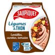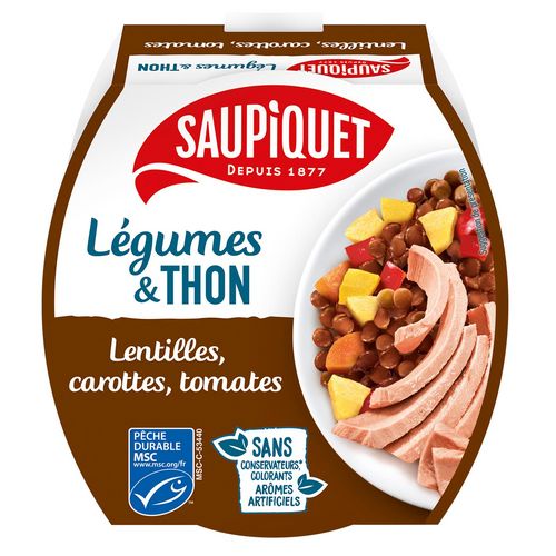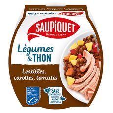 Lentilles (36%), THON listao* (23%), huile de maïs, carottes jaunes (9%), carottes (9%), tomates (6%), sel, arômes naturels. Peut contenir du GLUTEN.