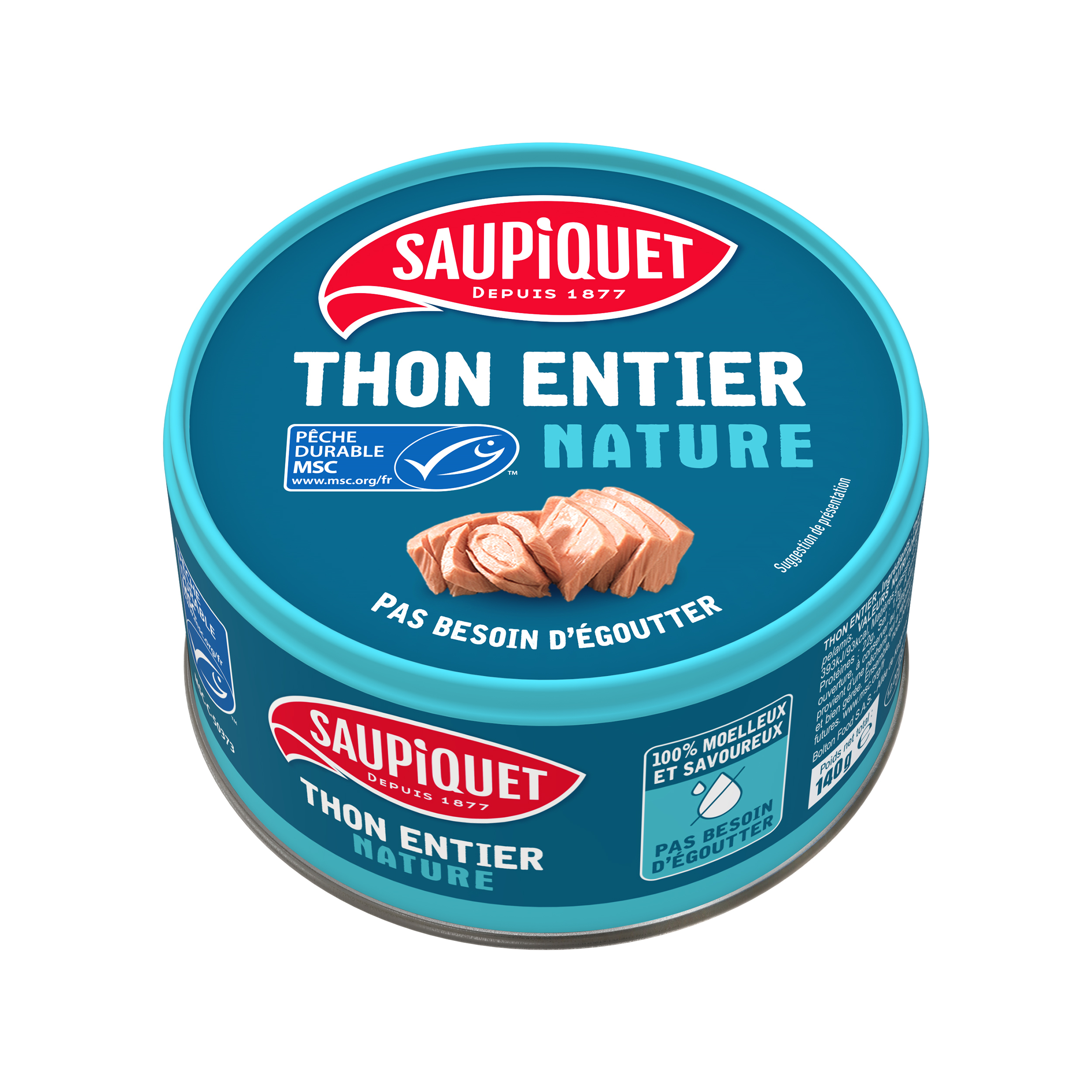 Si notre Thon Entier Nature est si bon, c'est parce que nous y avons ajouté notre touche. Il est issu d’une pêche durable, certifiée MSC, et contient juste ce qu’il faut d’eau pour le rendre si bon et si moelleux, sans avoir besoin de l’égoutter !
