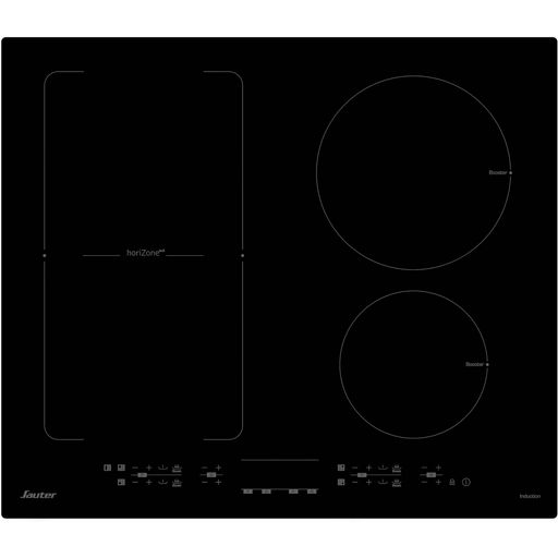 Sauter SPI1106B Table de cuisson induction Sauter SPI1106B avec espace de cuisson Horizone, commandes individuelles et réglages ultra précis.Horizone : Horizone est un large espace de cuisson (40x23cm) qui autorise de multiples combinaisons : grand plat unique (par exemple une grande cocotte ovale), deux faitouts ou encore trois petites casseroles.Commandes Individuelles : Chaque foyer induction dispose de commandes dédiées, pour cuisiner avec précision et rapidité. Pour plus de confort, ils sont équipés d'une minuterie indépendante.Réglages ultra précis : 10 positions de cuisson et touche booster: une énergie savamment dosée pour tout réussir.