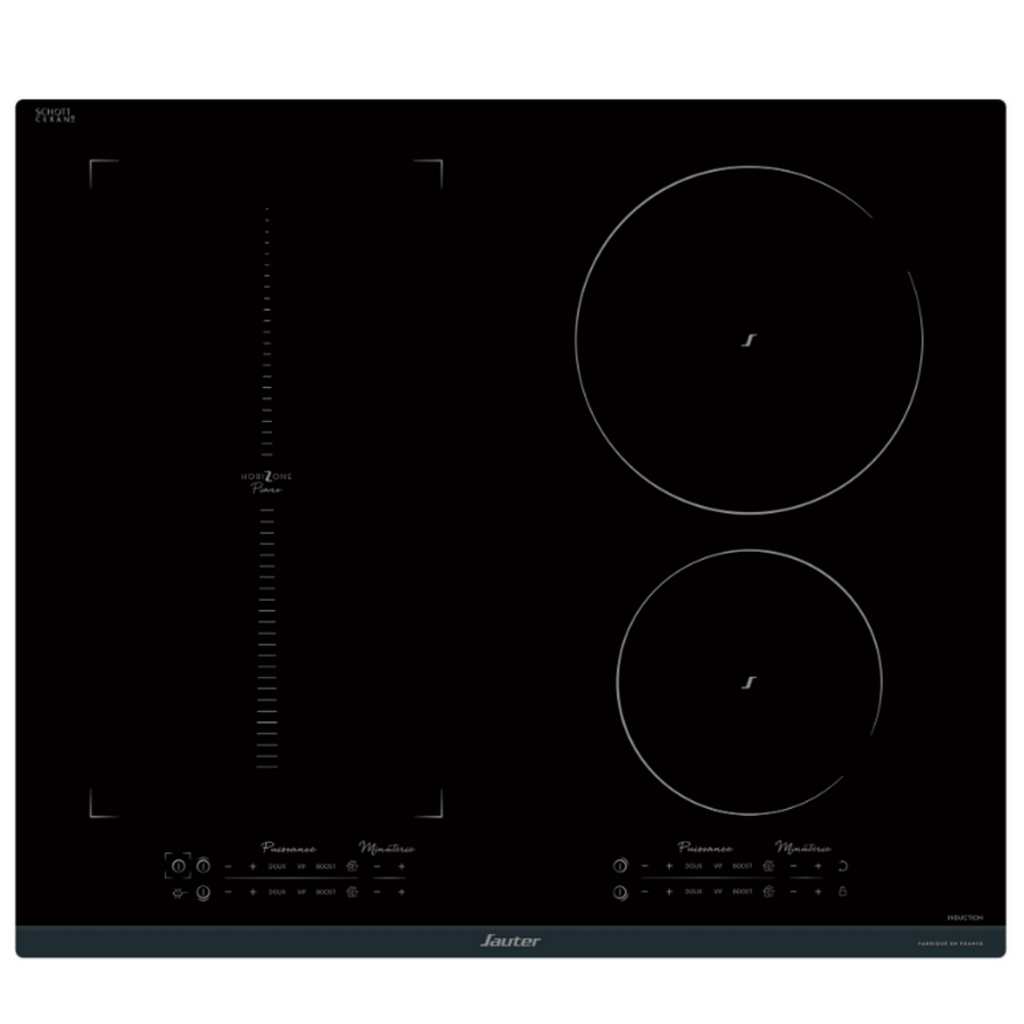 En savoir +Sauter SPI9647B Table de cuisson induction SPI9647B de Sauter avec fonction piano : la touche dédiée fonction piano, préprogrammée, divise l'espace horiZone en deux puissances distinctes. La zone avant permet de saisir les aliments pour ensuite les maintenir au chaud en faisant glisser le récipient sur la zone arrière. Horizone offre la modularité absolue. Cet espace accueille votre poissonnière, vos grands faitouts, ou encore plusieurs récipients. Il peut être dissocié en 2 foyers autonomes en conservant une répartition de température optimale. Commandes dédiées : chaque foyer a 14 positions de cuisson qui permettent un réglage très précis des températures. Il bénéficie en outre de 3 accès directs dont un Booster . Ces accès programmables (6--10) permettent un accès plus rapide aux puissances désirées.