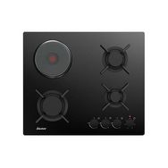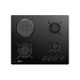 Table de cuisson mixte - Dessus verre trempé - 1 plaque et 3 brûleurs dont 1 semi-rapide 3 kW - Allumage intégré aux manettes - Sécurité gaz par thermocouple - Grilles mono-foyer fonte.
