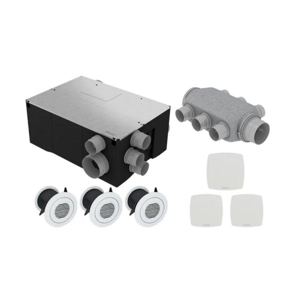 - Accessoires Conseillés, non fournis : Prise d'air neuf, bouches d'insufflation réglables, bouches d'extraction, gaines souples calorifugées et chapeau de toiture