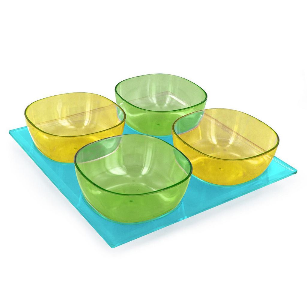 Un plateau et ses 4 coupelles parfait pour un apéritifFICHE TECHNIQUE- Plateau et coupelles en plastique.- Plateau également utilisable pour le service.CARACTERISTIQUES TECHNIQUES- Dimensions du plateau : L. 21 x l. 21 cm.- Dimensions des coupelles : Diam. 9,5 x H. 5,5 cm.