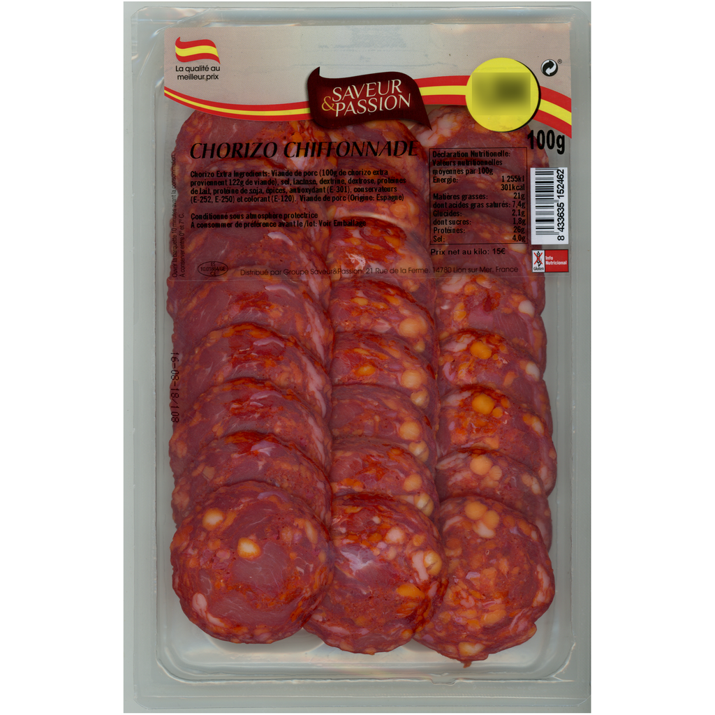 "Viande de porc (100 g de Chorizo extra proviennent 122