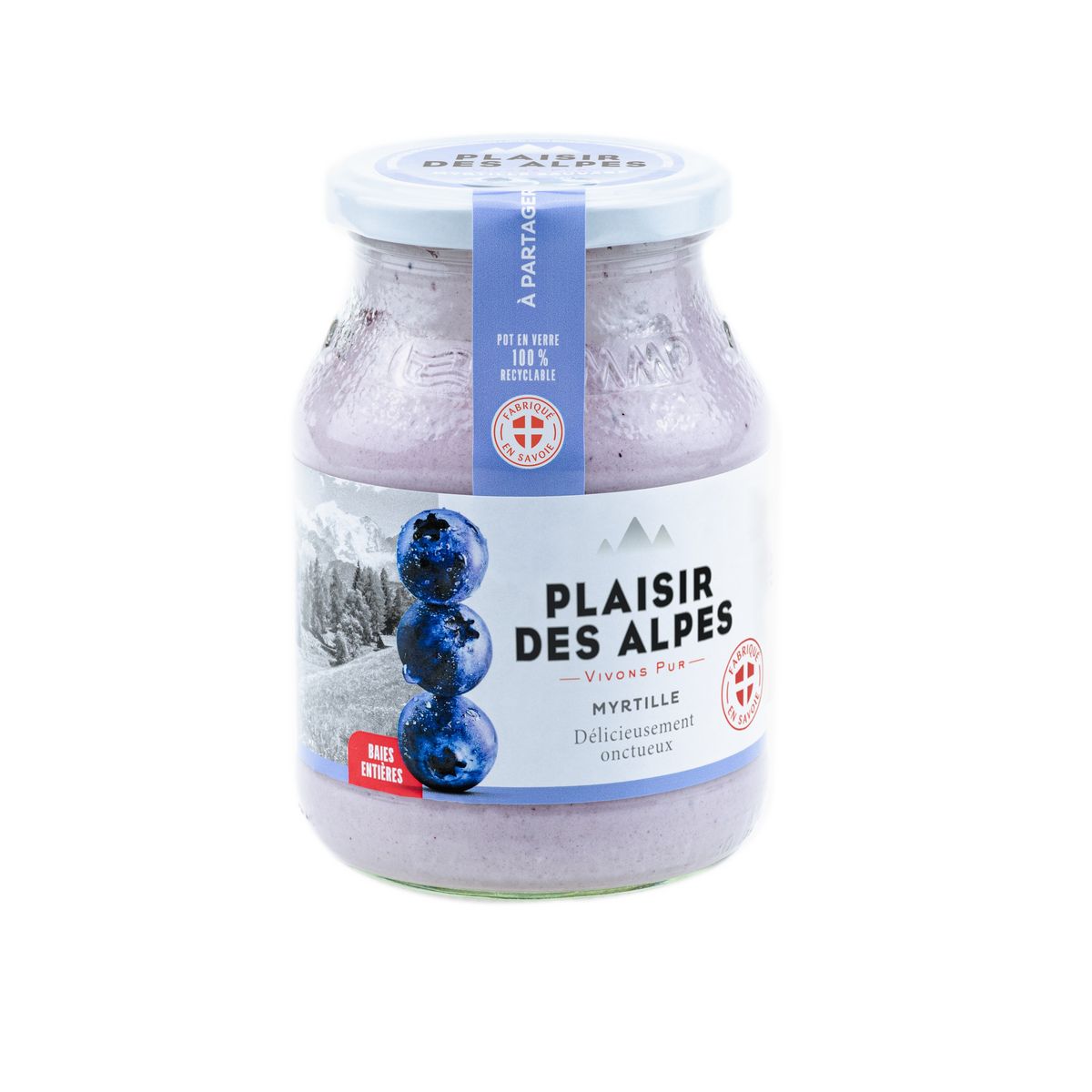lait* partiellement concentré, myrtille 8,8%, sucre 7,5%, purée de myrtille 3,8%, amidon, épaississant : pectine, arômes naturels, ferments lactiques.*origine : Savoie (France)