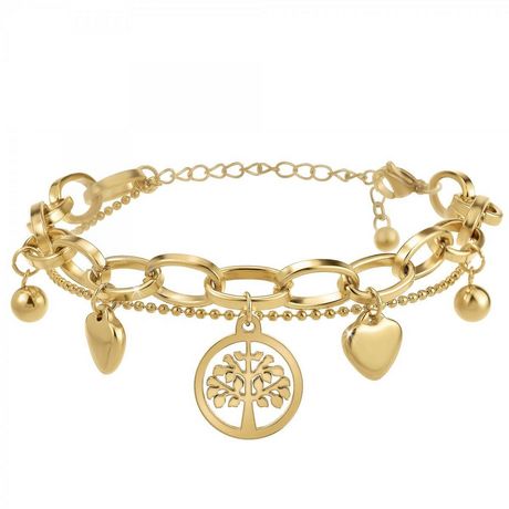 Bracelet par SC Bohème.Acier inoxydable.Longueur bracelet : 17cm (+5cm de rallonge)Dimensions pendentif arbre de vie : 15x15mmDimensions pendentif coeurs : 10x10mmDimensions pendentif boules : 6x6mmLargeur maille : 8mmFermoir : mousqueton.