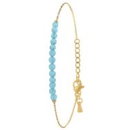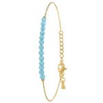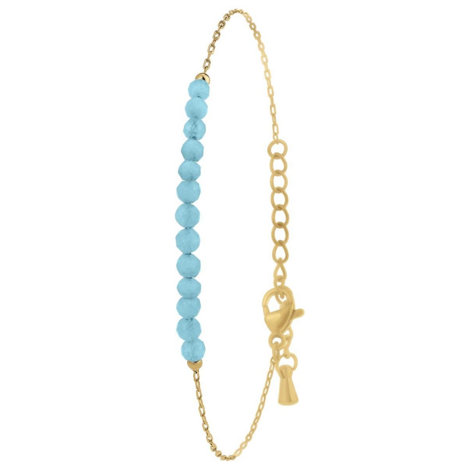 Bracelet SC Bohème orné d'aquamarinesPierre naturelleAcier inoxydable doré à l'or fin.Dimensions pendentif : 45x3mmLongueur bracelet : 16cm (+4cm de rallonge)Fermoir à mousqueton.Chaque perle est unique, peut présenter de légères irrégularités et variation de couleur.