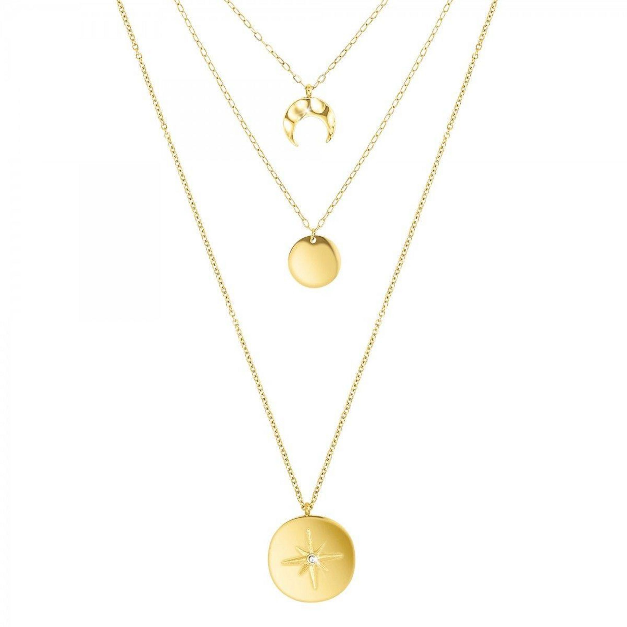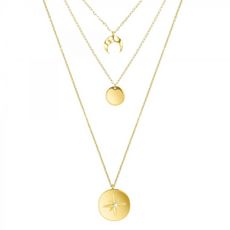 La mode et le luxe, tels sont les maîtres mots qui contrôlent le désir des femmes. Adoptez la tendance en vous offrant le collier à trois motifs. Les deux motifs principaux, lune et étoile, symbolisent le renouvèlement de la lumière que vous apportez à votre entourage. Il est fait d'un acier inoxydable doré à l'or fin qui saura révéler l'harmonie et la beauté de votre personne. Ce collier fait 39cm de longueur et s'ajuste selon vos désirs grâce à l'extension possible proposée de 5 cm.