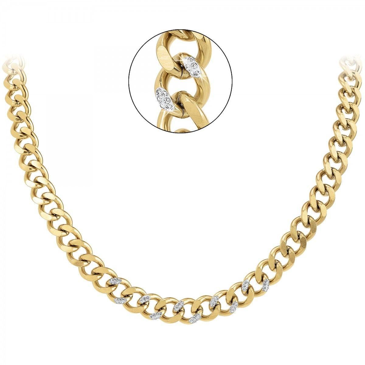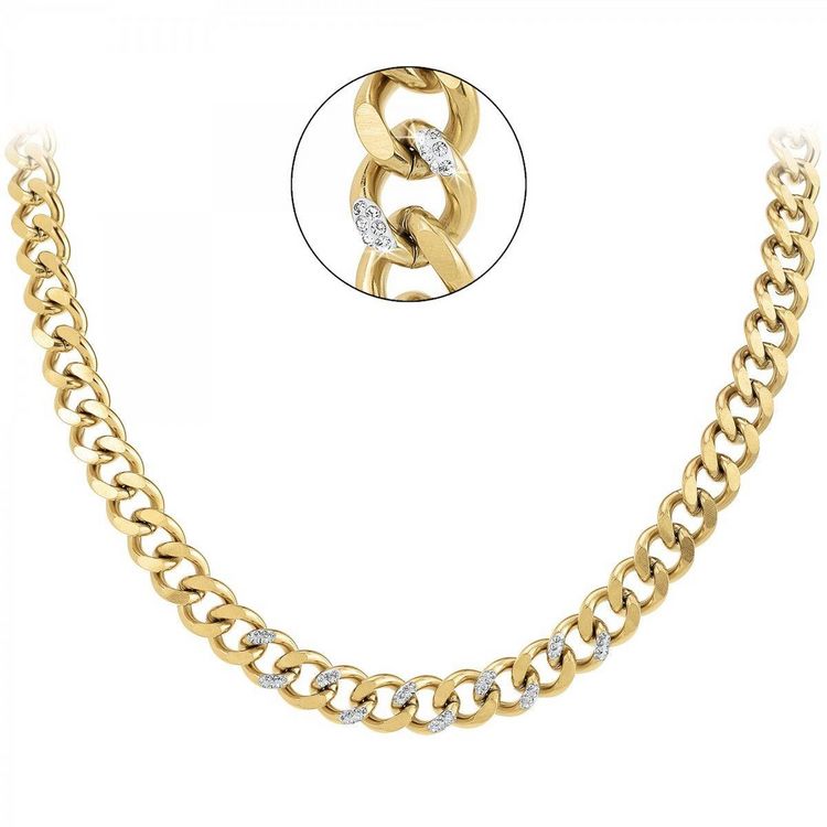 Collier SC Bohème.Orné de Cristaux scintillants.Acier inoxydable doré à l'or fin.Largeur maillons : 10mmLongueur collier : 39cm (+ 5cm de rallonge)Fermoir : mousqueton.