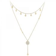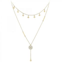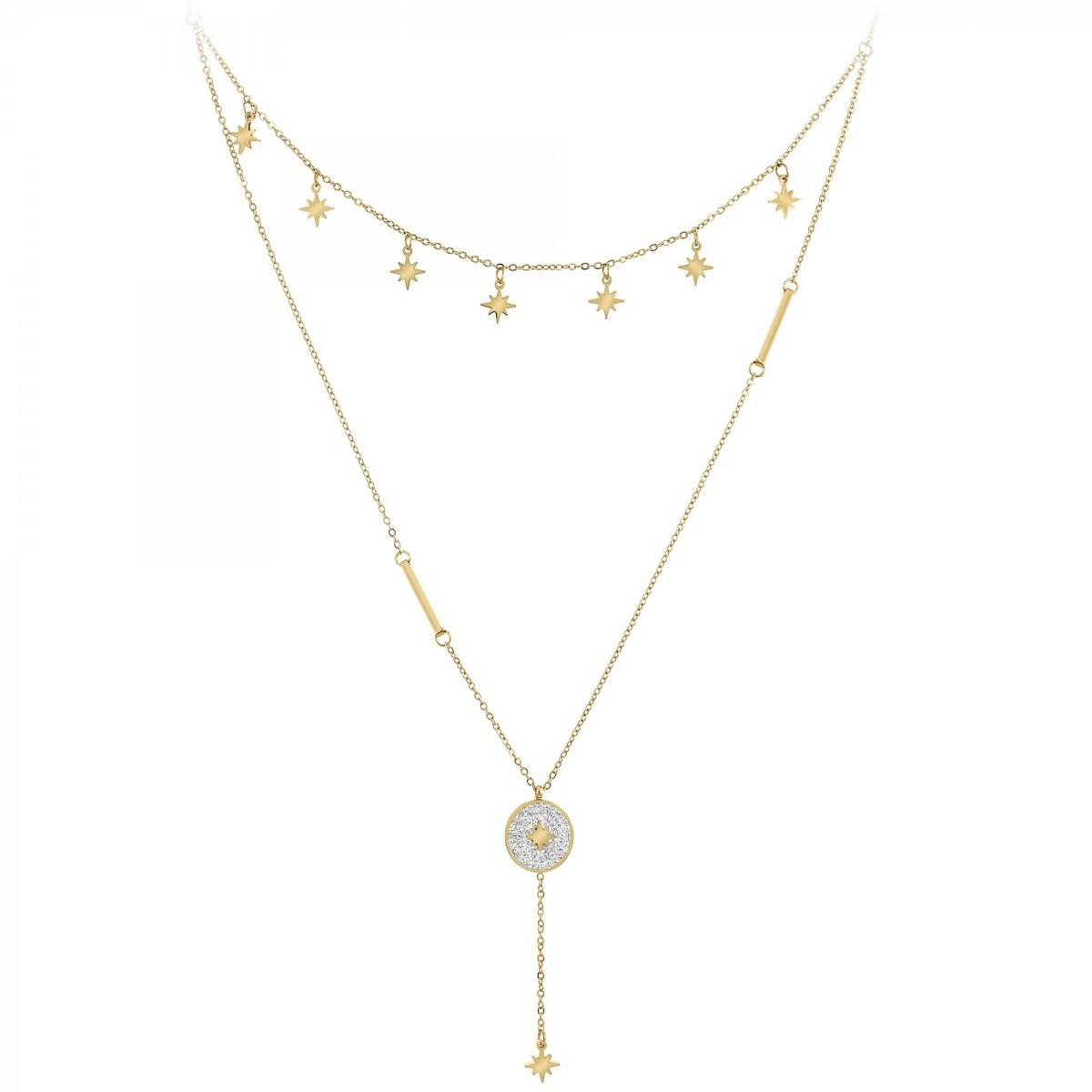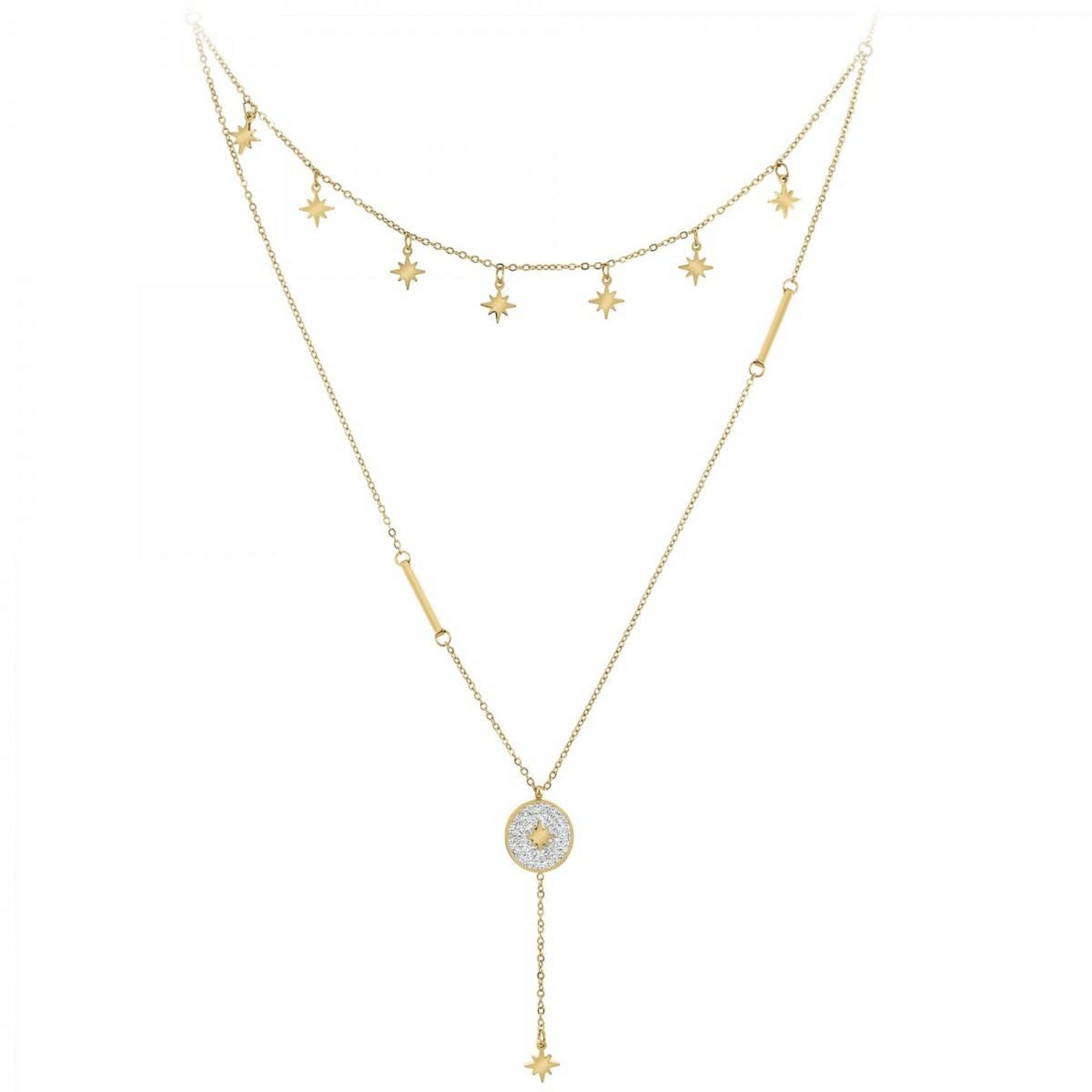 Collier par SC Bohème.Orné de Cristaux scintillants.Acier inoxydable doré à l'or fin.Longueur collier : 39cm (+5cm de rallonge)Dimensions pendentifs étoiles : 6x6mmDimensions pendentif : 12x12mmHauteur totale pendentif : 51mmFermoir à mousqueton.