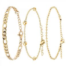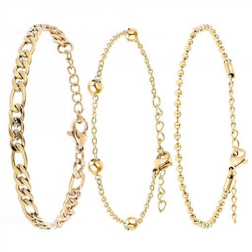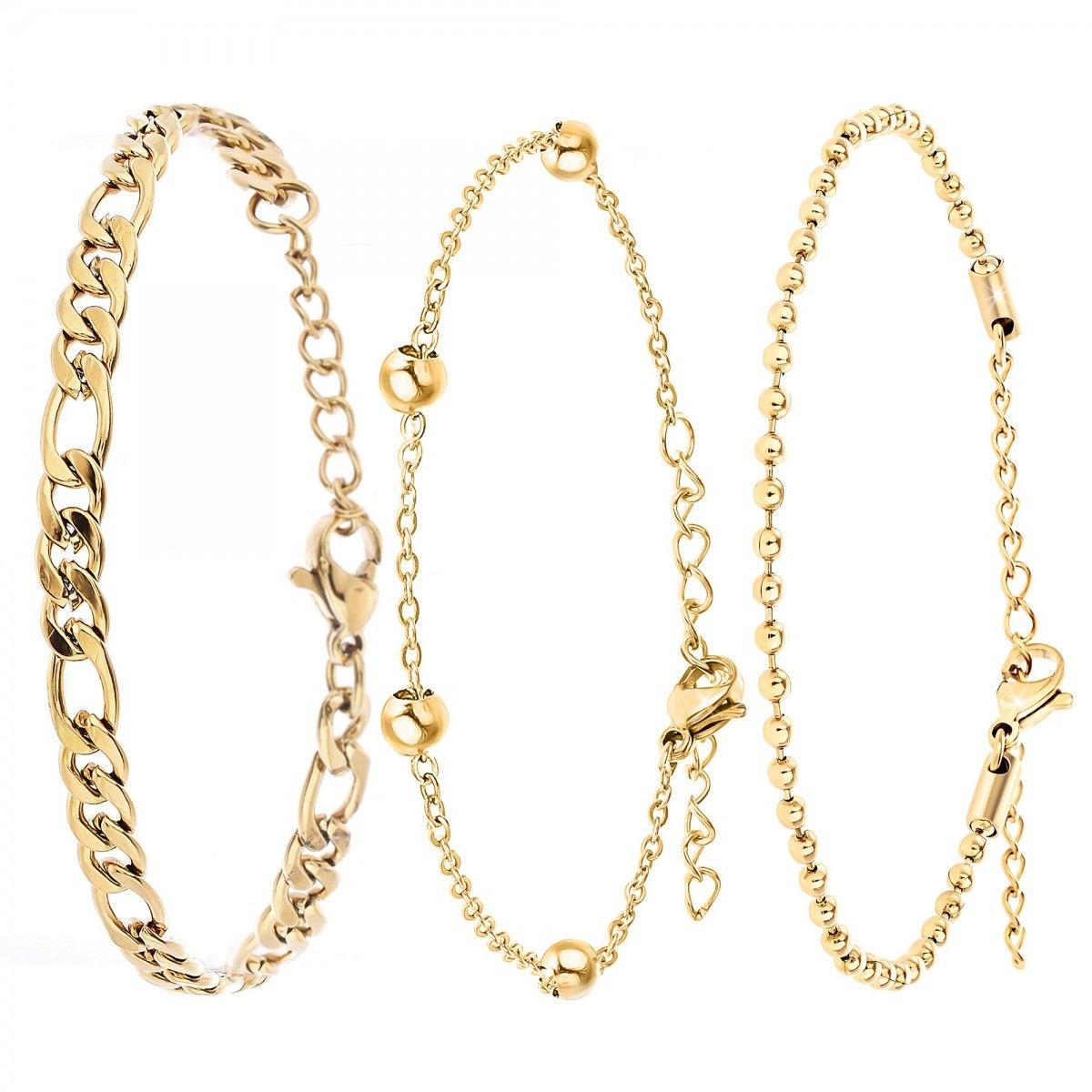 Intemporel dans sa construction en acier inoxydable à l'or fin, cet ensemble de bracelets élégants deviendra votre accessoire préféré pour les années à venir. Tous les éléments de cette collection orneront et ajouteront de la délicatesse à votre poignet. Ils se complètent de manière tout à fait harmonieuse, malgré le fait que leurs maillons aient des structures différentes, de fines à épaisses. Que vous soyez une femme plus timide, réservée, extravertie ou insouciante, cet ensemble de 3 bracelets rehaussera votre style.