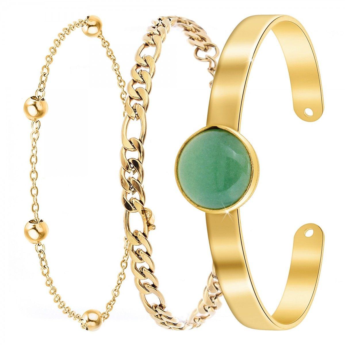Être différent, c'est parfois la seule chose qu'on a à offrir. Clamez votre différence avec ce lot de 3 bracelets Angèle M qui brise les codes. Vous y trouverez un bracelet en forme de gourmette ouverte orné d'une pierre naturelle verte. Il est accompagné d'un bracelet en forme de chaîne et orné de plusieurs boules d'une taille unique de 4 mm. Le dernier bracelet pour sa part se présente sous forme de gourmette fermée étalant des mailles successives d'une taille de 5 mm. Ces bracelets sont en acier inoxydable, dorés à l'or fin et équipés d'un fermoir mousqueton. D'une longueur de 17 cm, ils peuvent être rallongés de 3 cm.