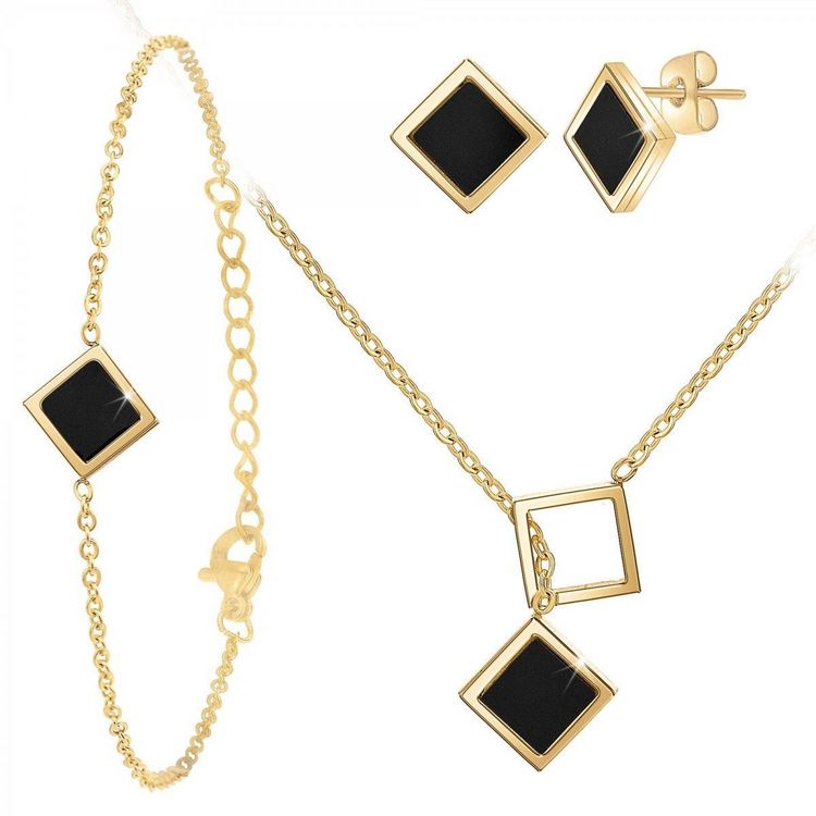 Boucles d'oreilles par SC Bohème.Acier inoxydable doré à l'or fin.Dimensions pendentif : 11x11mmFermoir : piercingCollier par SC Bohème.Acier inoxydable doré à l'or fin.Longueur collier : 46cmDimensions pendentifs : 11x11mmFermoir : mousquetonBracelet par SC Bohème.Acier inoxydable doré à l'or fin.L