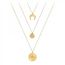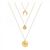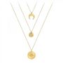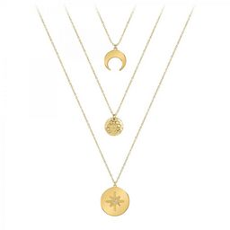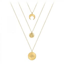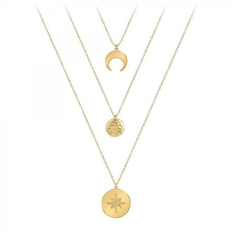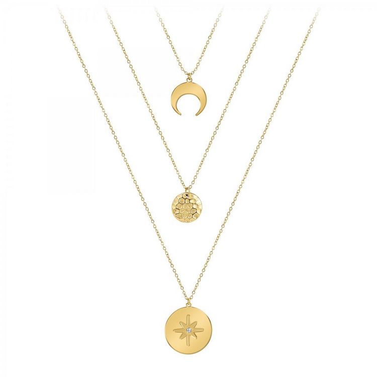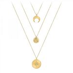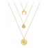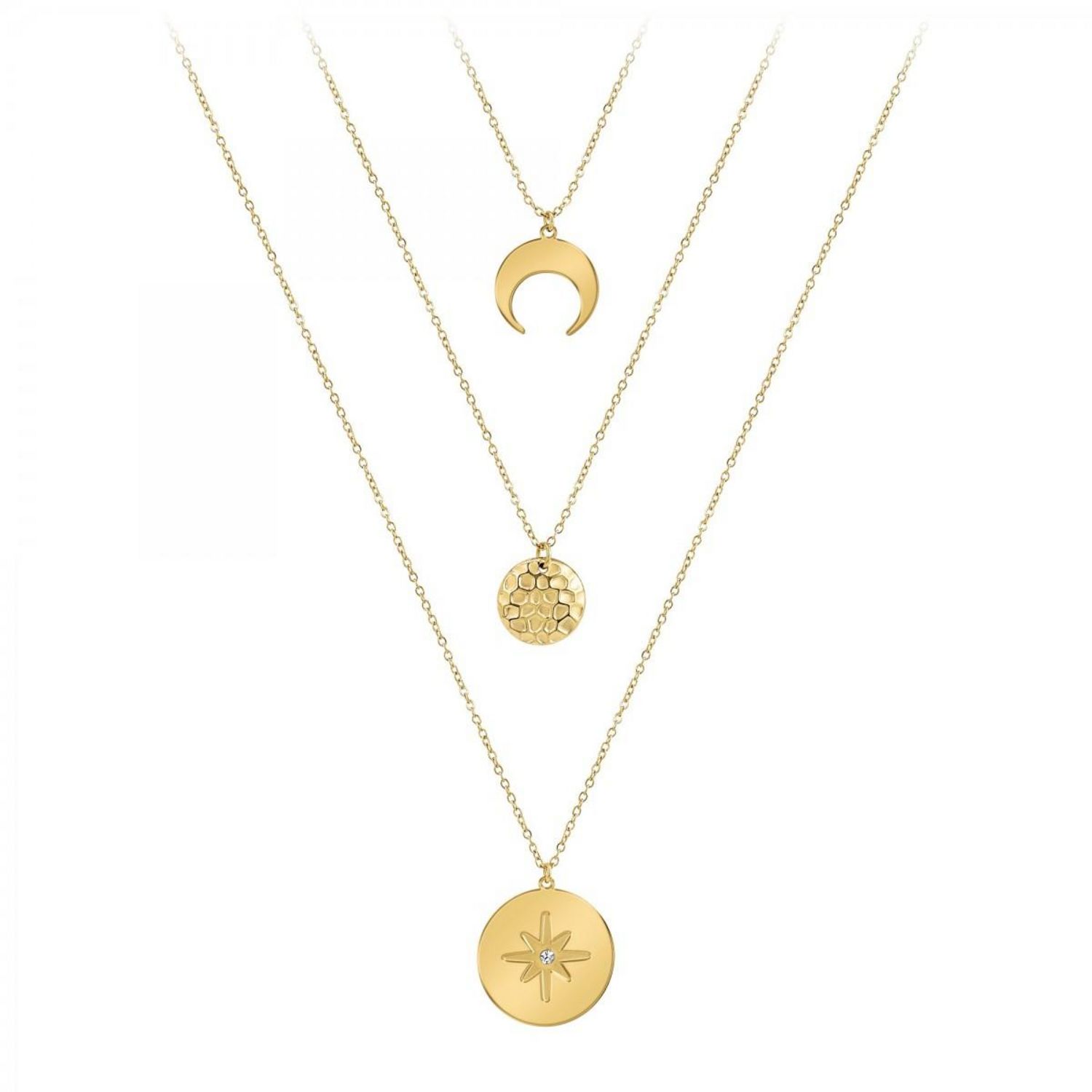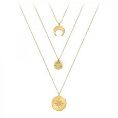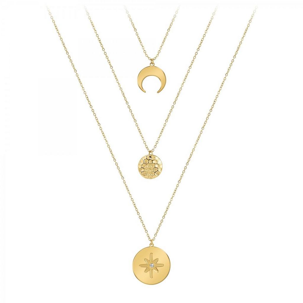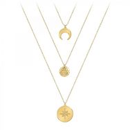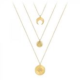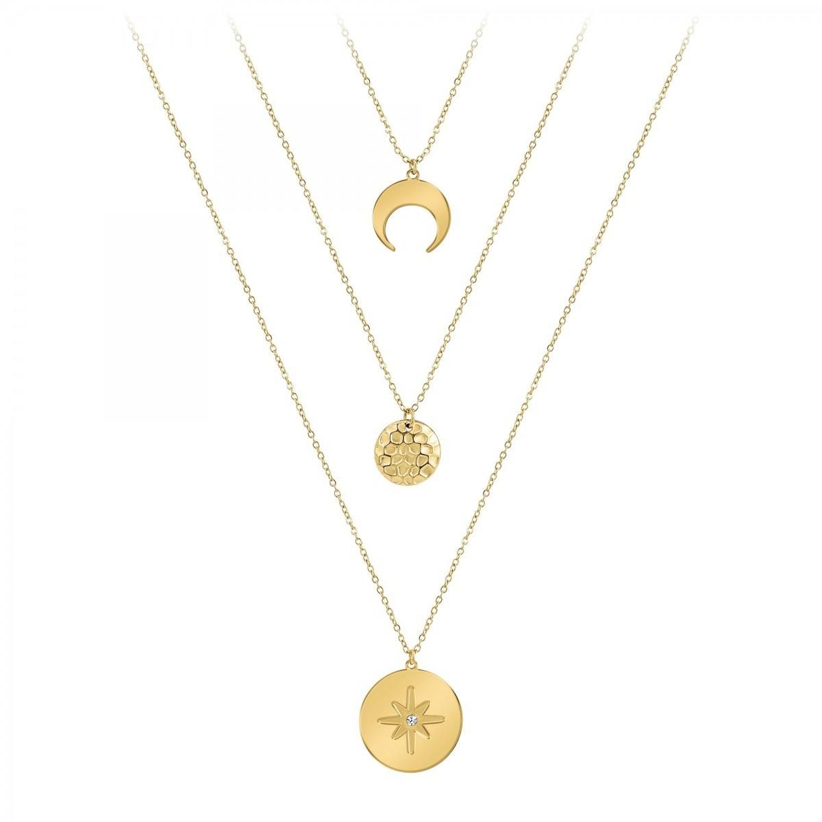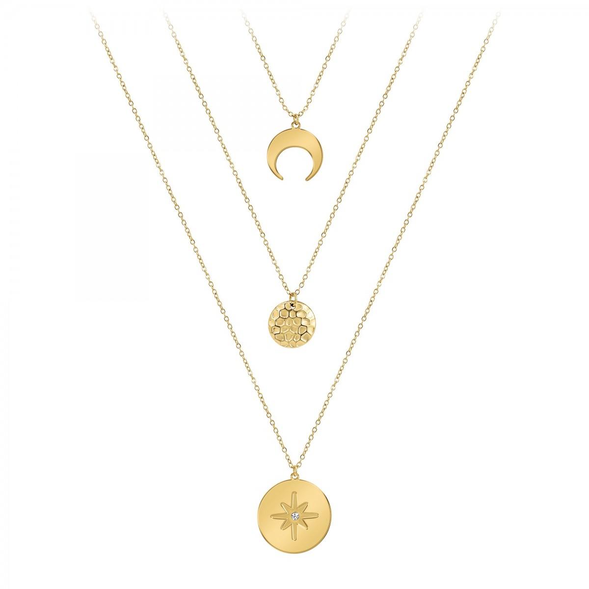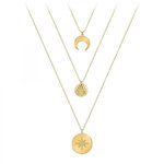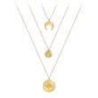 Sautoir par SC BohèmeAcier inoxydable doré à l'or fin.Longueur collier : 53cm (+5cm de rallonge)Dimensions pendentif 1 : 15x15 mmDimensions pendentif 2 : 13x13 mmDimensions pendentif 3 : 20x20 mmFermoir à mousqueton.