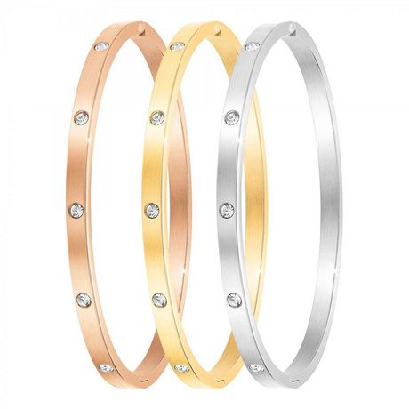 Caractérisé par son originalité pour enrichir votre beauté, ce trio de bracelets exprime de la vigueur et la vitalité de votre élégance. Ces 3 bracelets SC Crystal or rose-or-argent très faciles à porter étincellent brillamment à votre poignet grâce aux cristaux qui scintillent de tout leur éclat. Inspirés et conceptualisés autour d'un style unique, ils sont élégamment ornés et rehaussés d'un pavé de Cristaux scintillants en acier inoxydable, ce qui donne un design éclatant avec une finition soyeuse. Coordonnez-les et émaillez vos bras de bijoux pour un look tendance. Votre bijou est livré dans son pochon de satin.