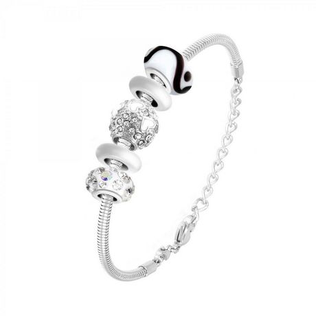 Bracelet composé de charms perles en verre décoré à la main, ornés de cristaux scintillants et 2 espaceurs en acier.Dimension des charms: 13 à 14 mm.Dimensions du bracelet: 18cm (+5cm de rallonge).Fermoir en mousqueton.Acier inoxydable (garanti sans nickel).Compatible avec les marques Pandora, Chami
