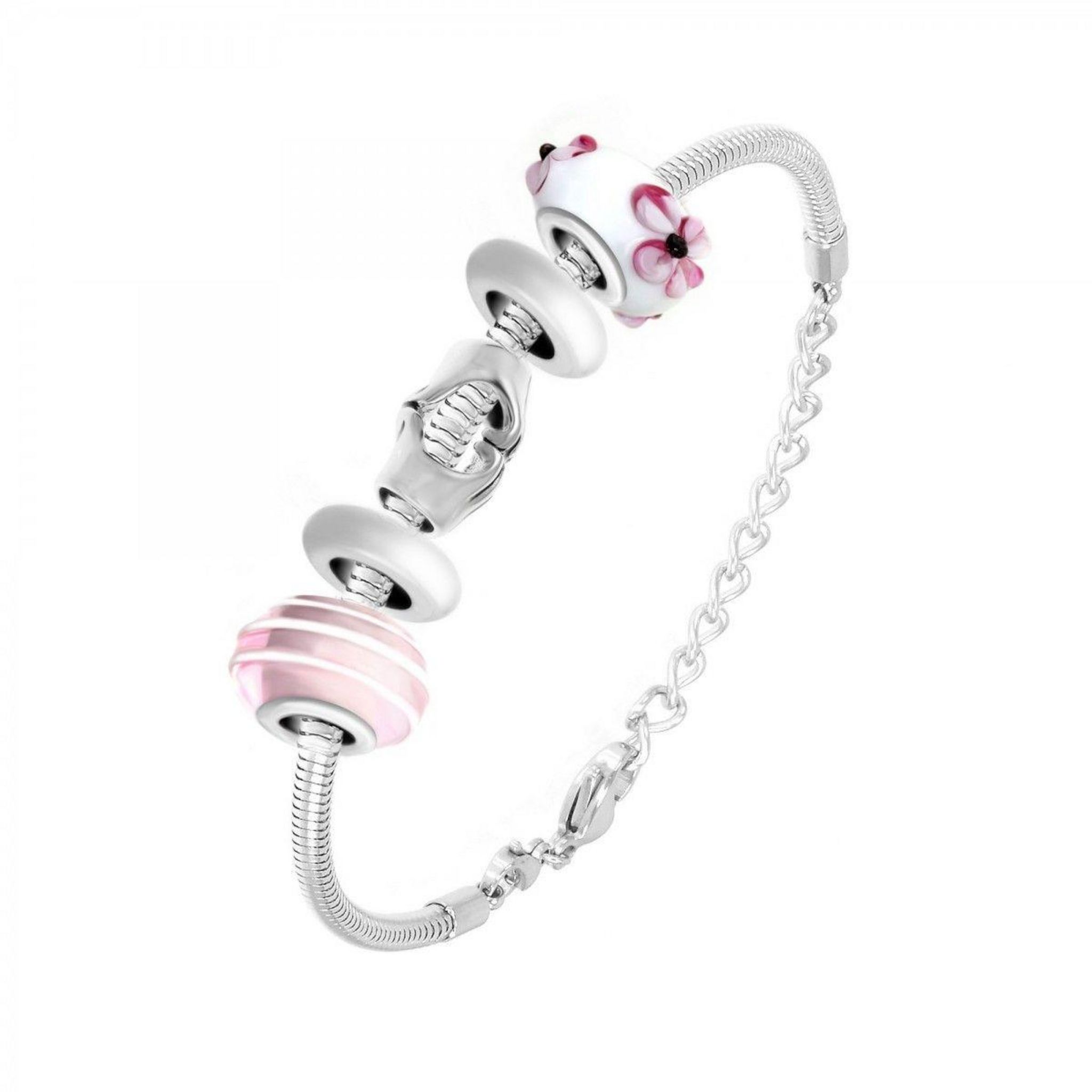 Bracelet composé de charms perles en acier, en verre décoré à la main et 2 espaceurs en acier.Dimension des charms: 13 à 14 mm.Dimensions du bracelet: 18cm (+5cm de rallonge).Fermoir en mousqueton.Acier inoxydable (garanti sans nickel).Compatible avec les marques Pandora, Chamilia, ...Charm perle SC