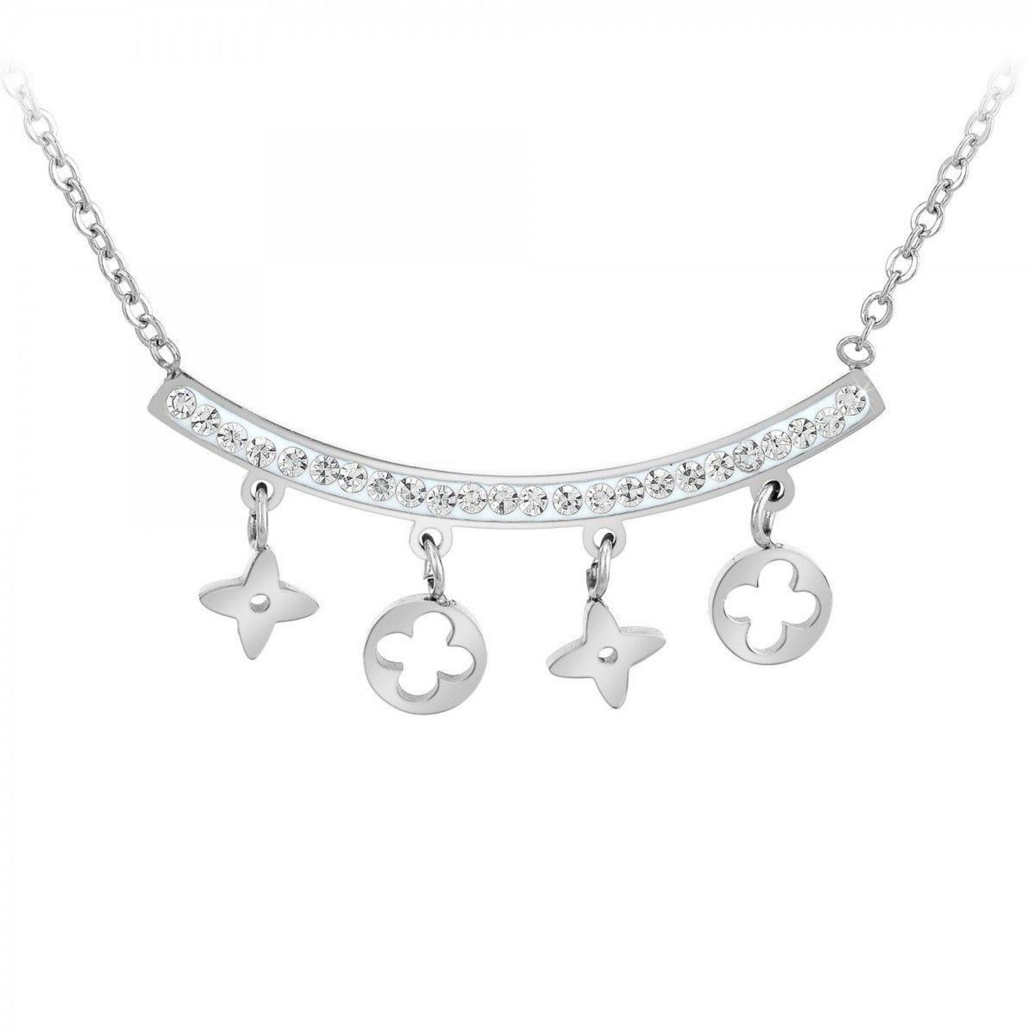 Collier SC CrystalOrné de Cristaux scintillants.Acier inoxydable.Hauteur pendentif : 16mmLargeur pendentif : 32mmEpaisseur pendentif : 2mmDimensions petits pendentifs : 5x5x1mmLongueur : 41cm (+ 5cm de rallonge)Fermoir : mousqueton