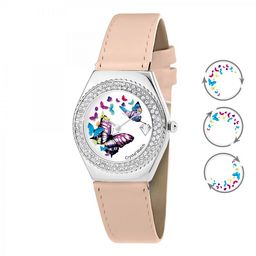 Avec un design audacieux et un éclat fabuleux, la montre Alysson papillon à mouvement tournant est une merveilleuse création qui vous confère une allure de pure élégance. Magnifiée d'un cadran orné en dents de scie merveilleusement expressif, un boîtier en acier inoxydable, un bracelet en cuir beige en forme de papillons multicolores tournant autour du cadran complètent ce design unique. Magnifiquement modelé, ce design ultra féminisé est agrémenté d'une lunette recouverte d'un micro-pavé de 87 Cristaux scintillants brillants et d'un mouvement Quartz haute fiabilité.