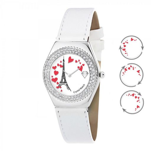 Rehaussez l'éclat de votre brillance avec cette audacieuse et élégante montre Alysson Tour Eiffel à mouvement tournant conceptualisée autour d'un style minimaliste. Adoptez une allure étincelante avec cette montre extraordinaire dont la lunette est recouverte d'un micro-pavé de 87 Cristaux scintillants brillants. Un cadran orné en dents de scie merveilleusement expressif, un boîtier en acier inoxydable, un bracelet en cuir blanc et un mouvement des secondes en forme de cœur tournant autour du cadran complètent ce design unique. Irradiant un éclat Crystal Watch signature, elle est idéale pour offrir.